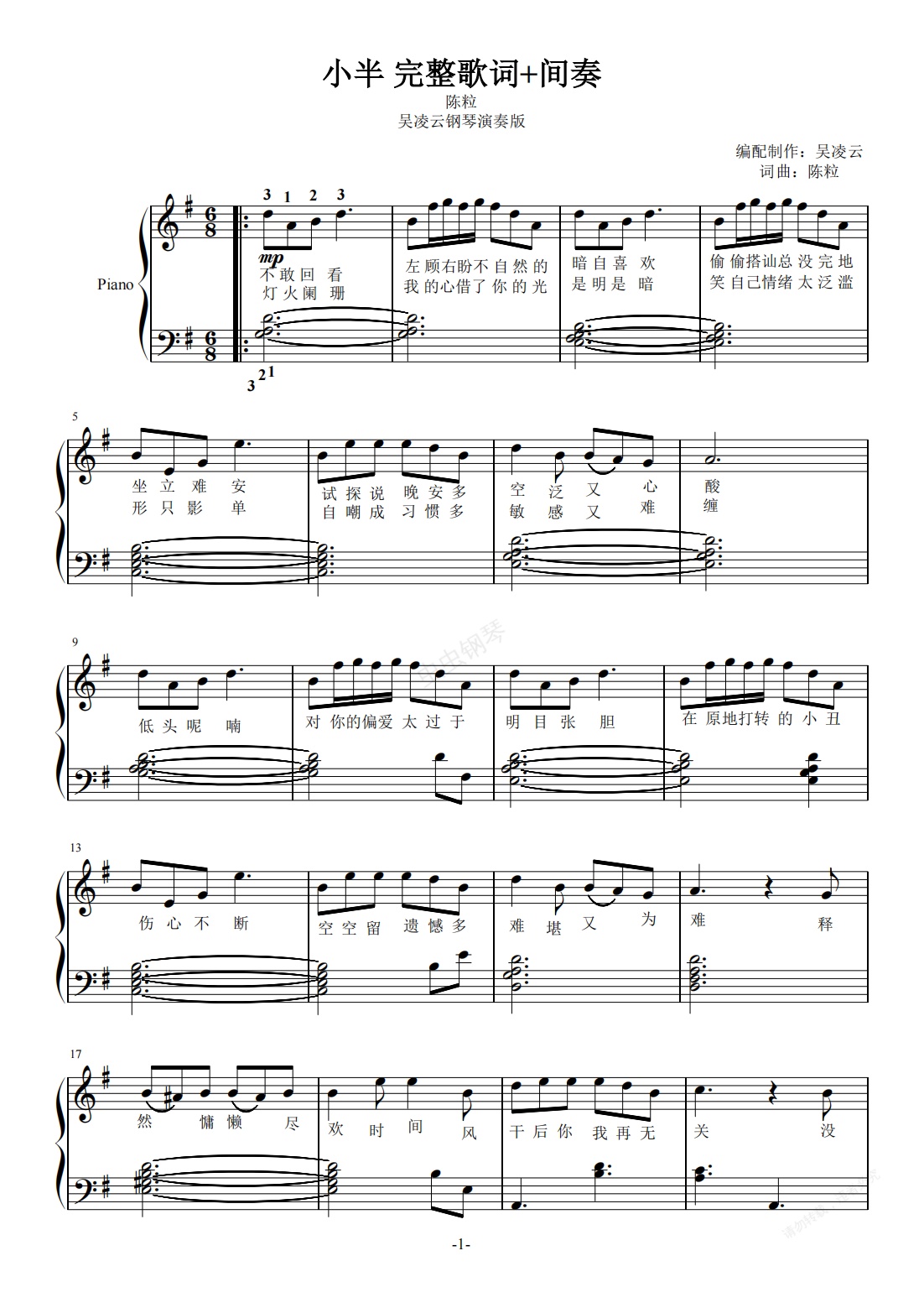 钢琴谱:小半-陈粒 完整版 歌词+间奏 +指法 吴凌云钢琴演奏版