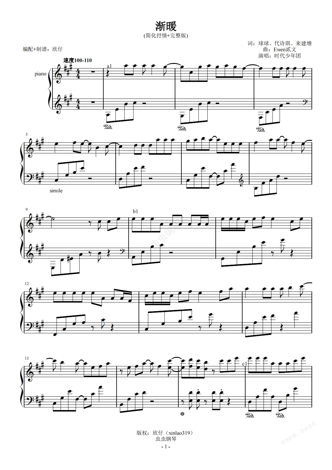 钢琴谱:时代少年团-A《渐暖》(简化抒情+完整版)