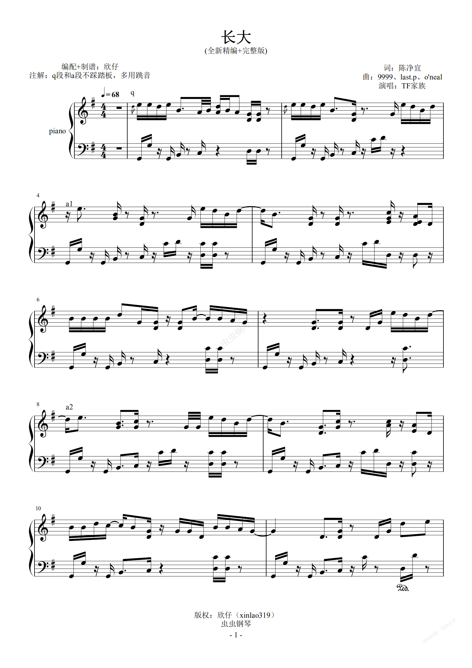 钢琴谱:TF家族-G《长大》(全新精编+完整版)