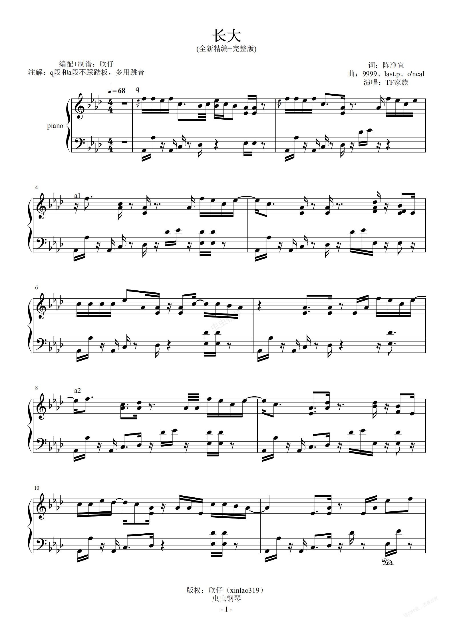 钢琴谱:TF家族-降A《长大》(全新精编+完整版)