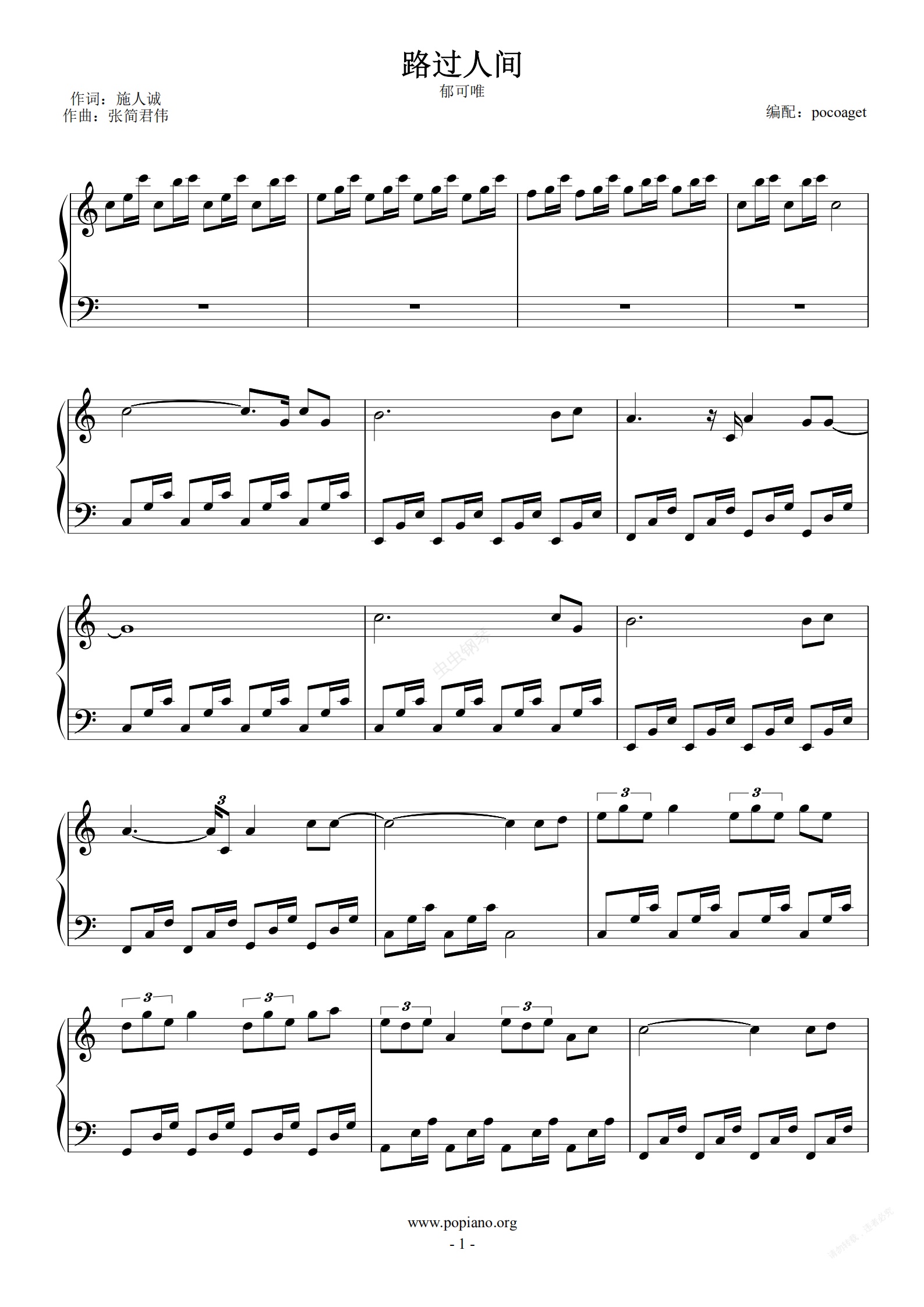 钢琴谱:《路过人间》郁可唯C调,左手规律初学者好上手版