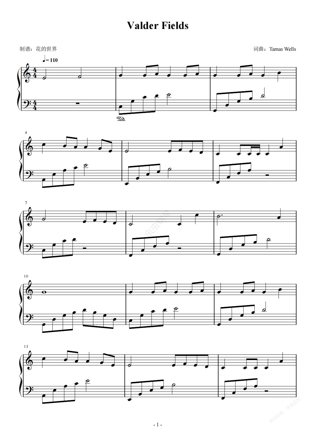 钢琴谱:Valder Fields C调简易版 Tamas Wells 流行经典
