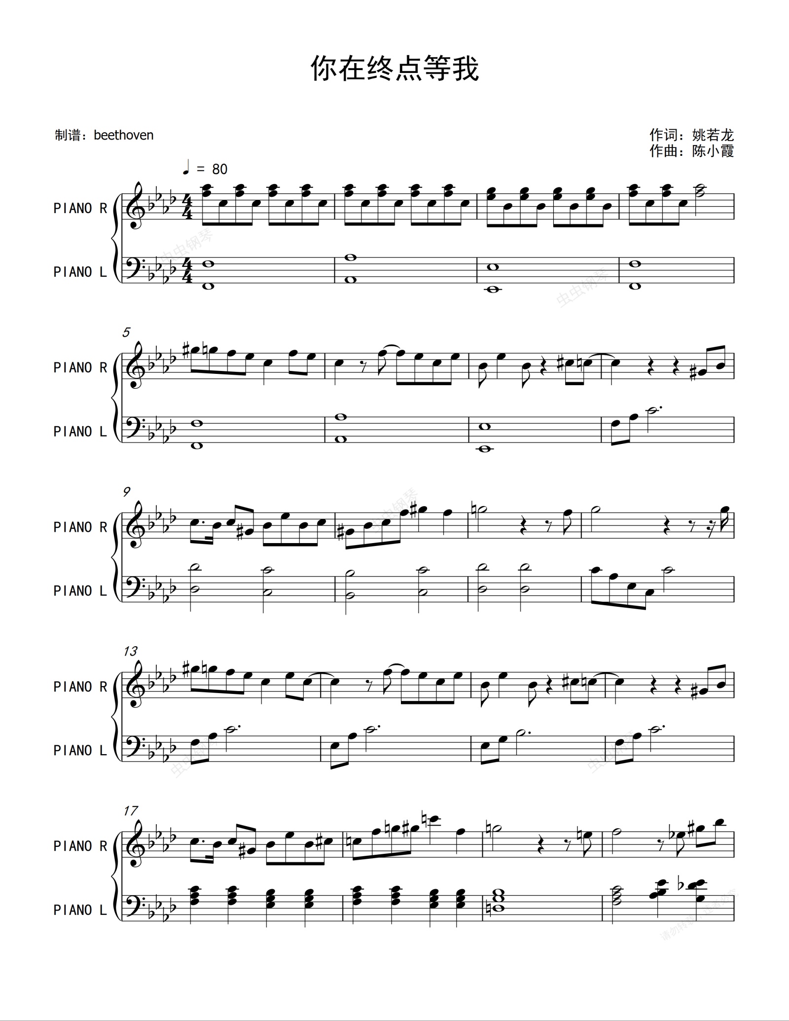 钢琴谱:你在终点等我-王菲-原版-《从你的全世界路过》片尾曲