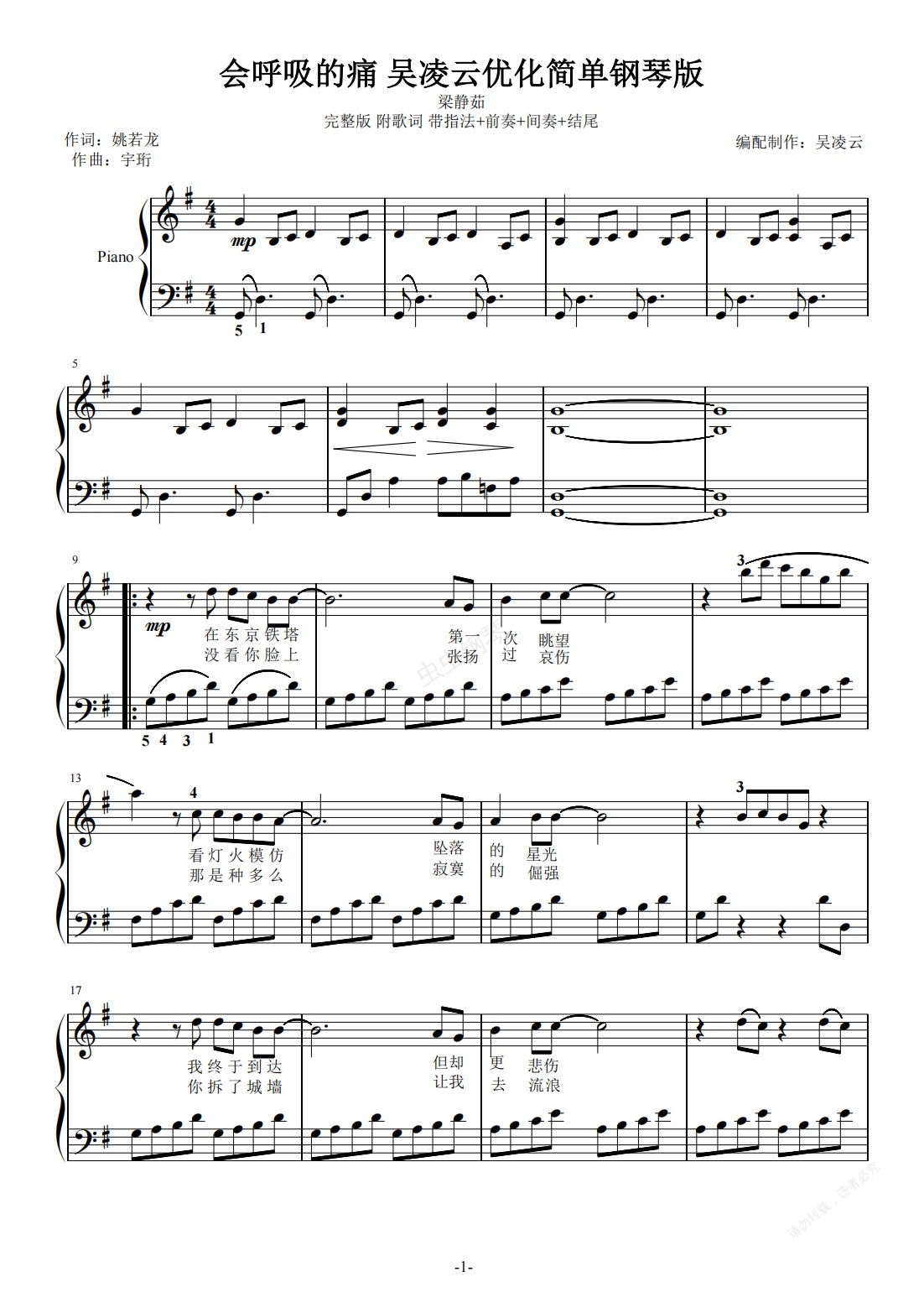 钢琴谱:会呼吸的痛 吴凌云优化简单钢琴版 完整版 附歌词 带指法+前奏+间奏+结尾
