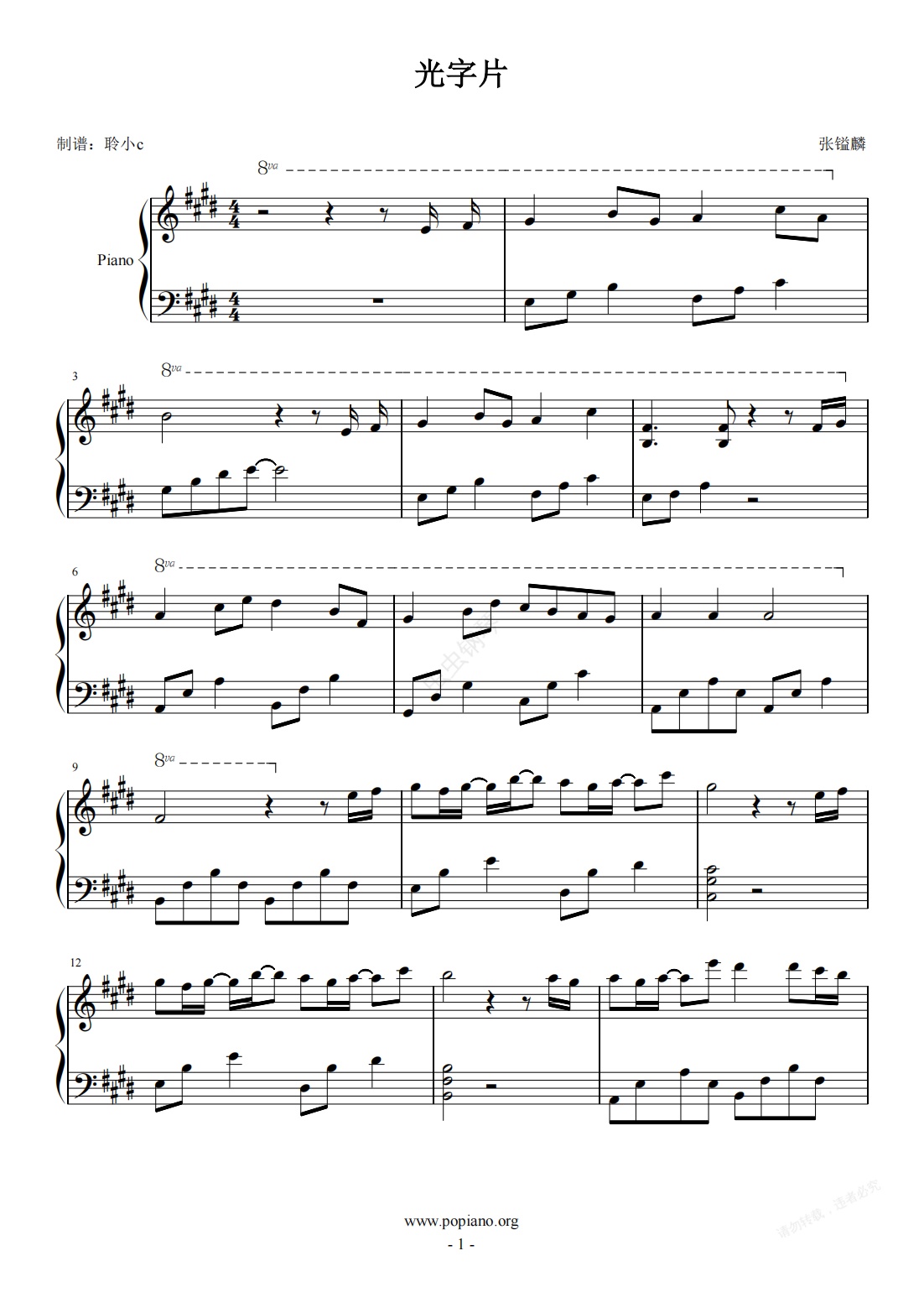 钢琴谱:光字片 E调