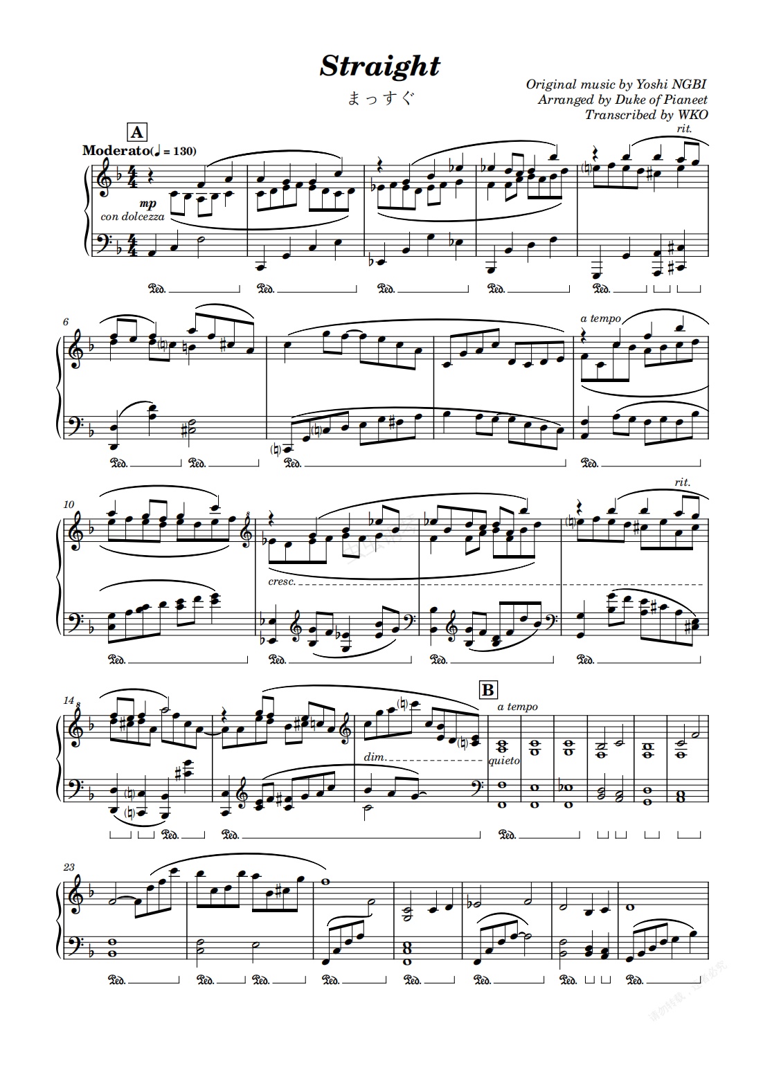 钢琴谱:Straight (まっすぐ)