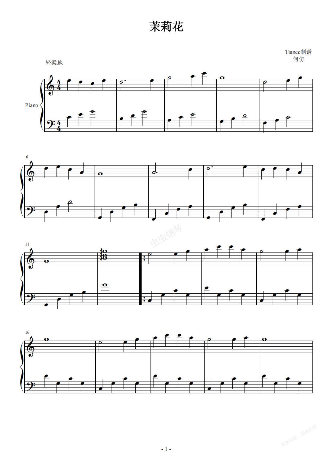 钢琴谱:《茉莉花》成人教学专用,拜厄难度