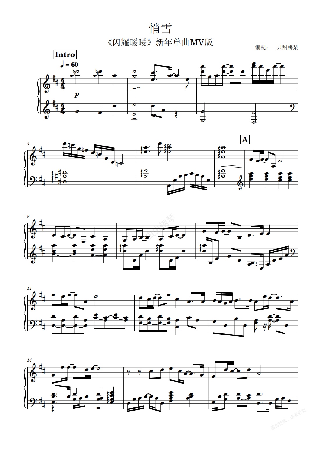 钢琴谱:《闪耀暖暖》新年单曲MV《悄雪》纯钢琴版