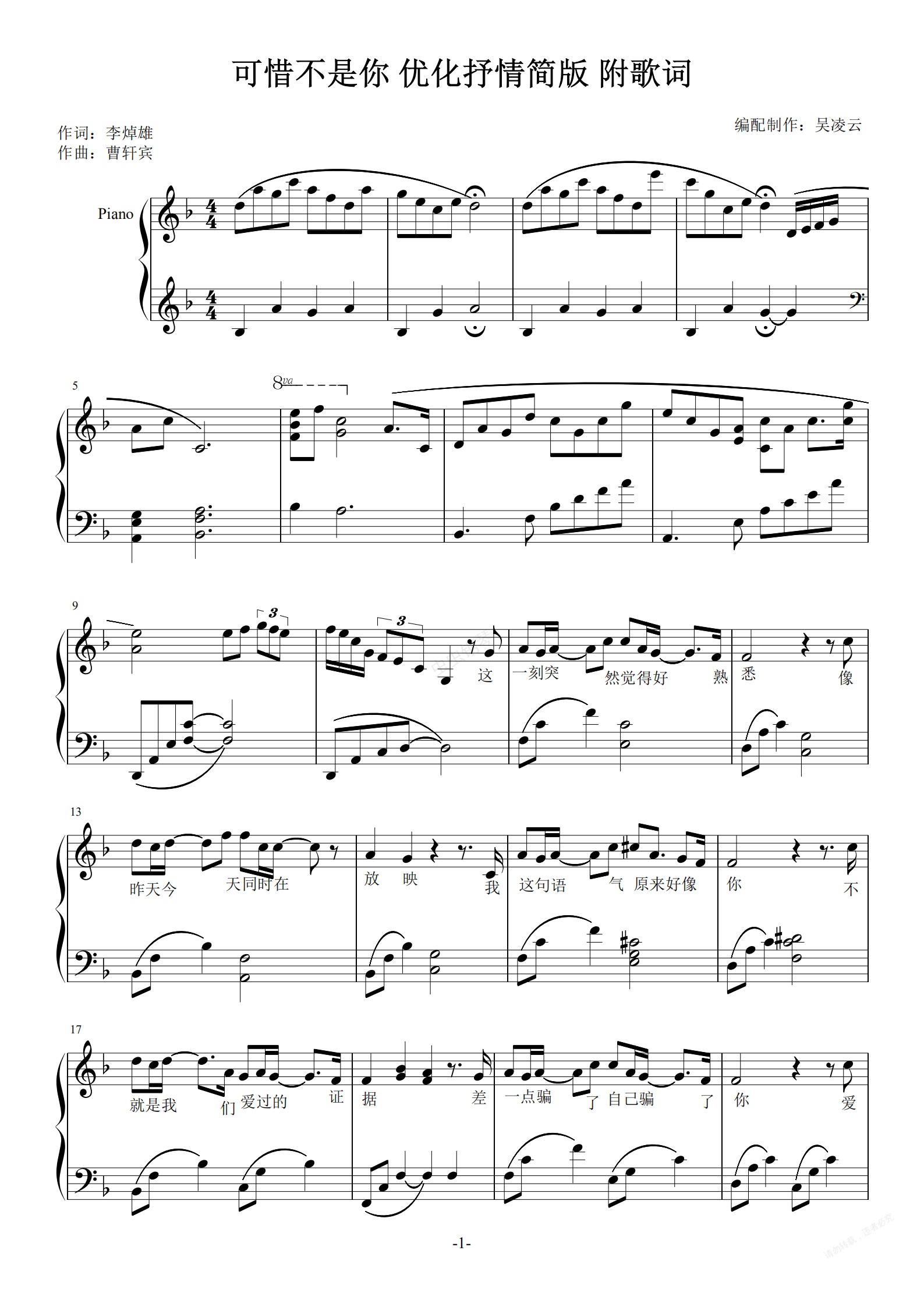 钢琴谱:可惜不是你 优化抒情简版 附歌词 吴凌云钢琴抒情版