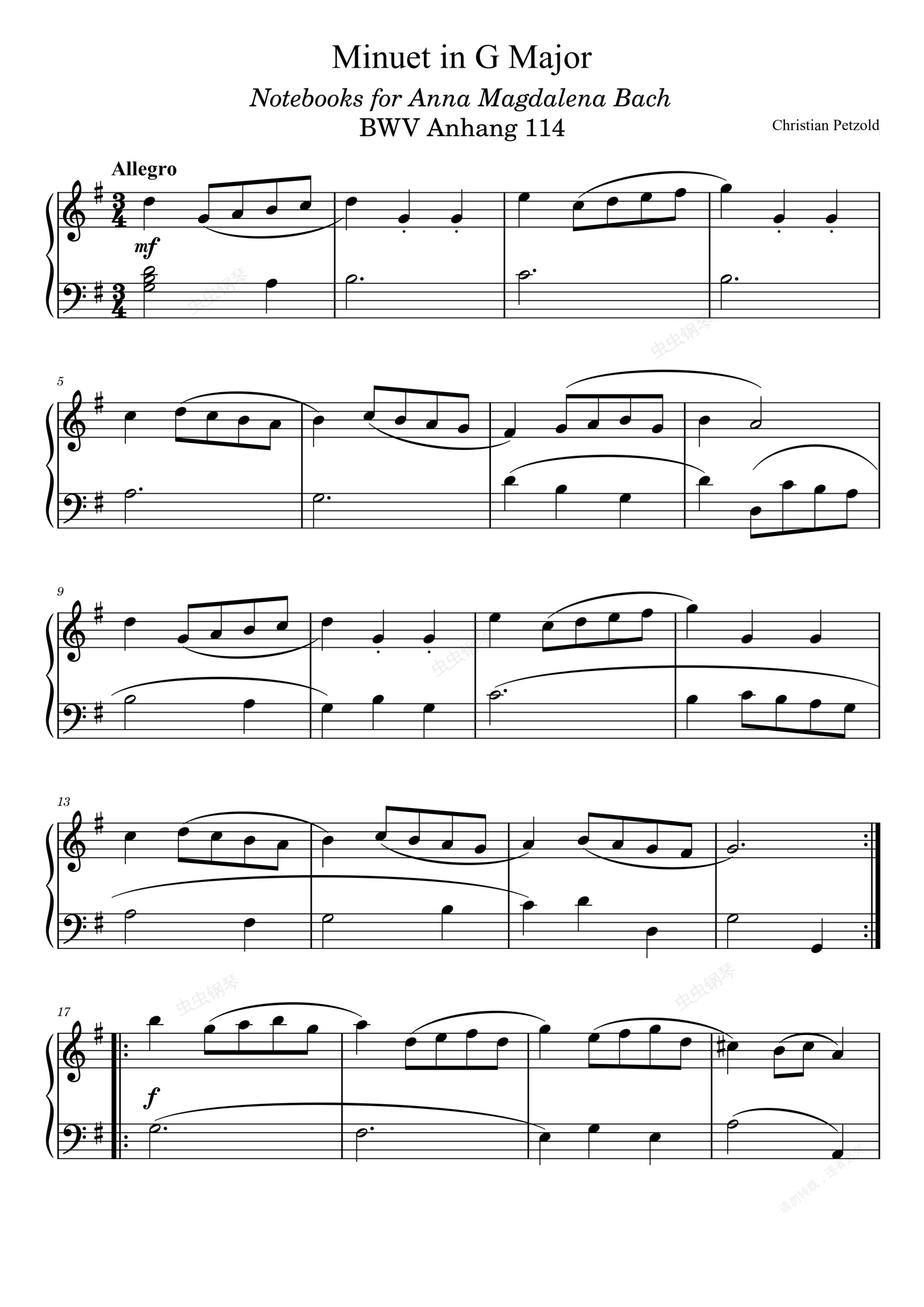 钢琴谱:巴赫 小步舞曲 Bach: Minuet in G Major (BWV Anh. 114)