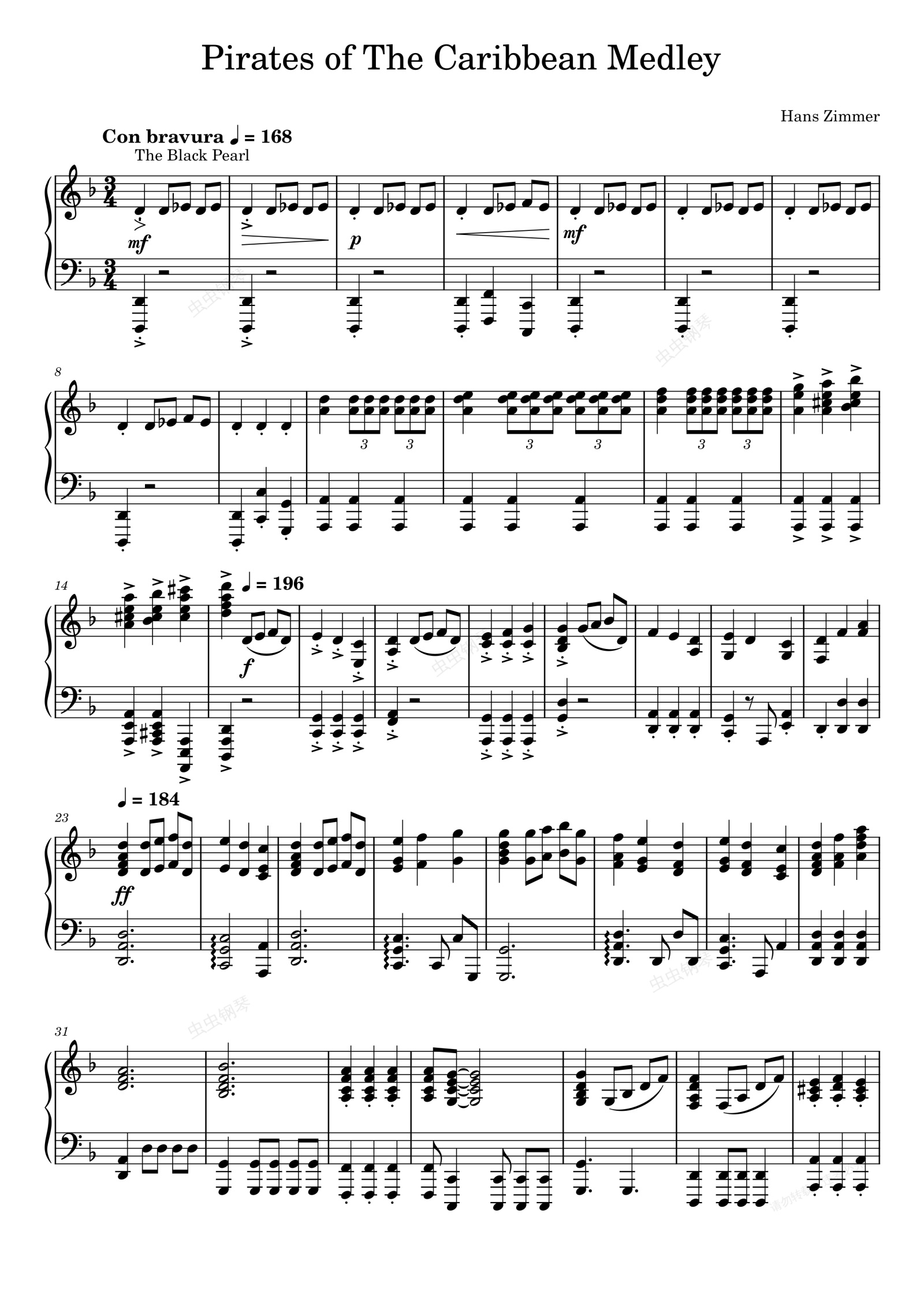 钢琴谱:加勒比海盗 电影 Pirates Of The Caribbean Medley – Hans Zimmer
