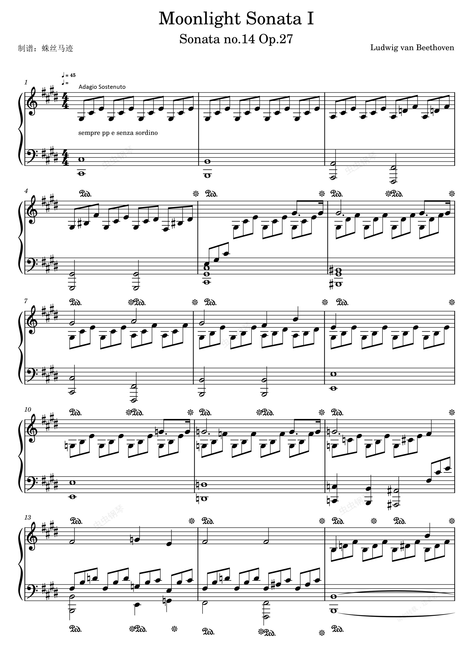 钢琴谱:贝多芬《月光奏鸣曲》第一乐章钢琴谱 Sonata No. 14 "Moonlight Sonata"