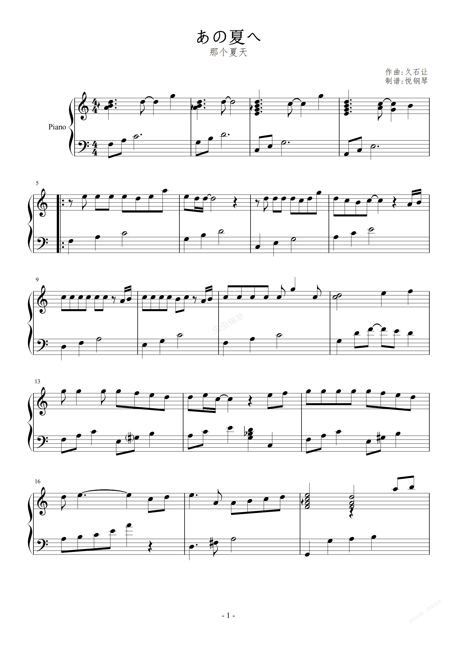 钢琴谱:《那个夏天》One Summer's Day(电影千与千寻插曲)
