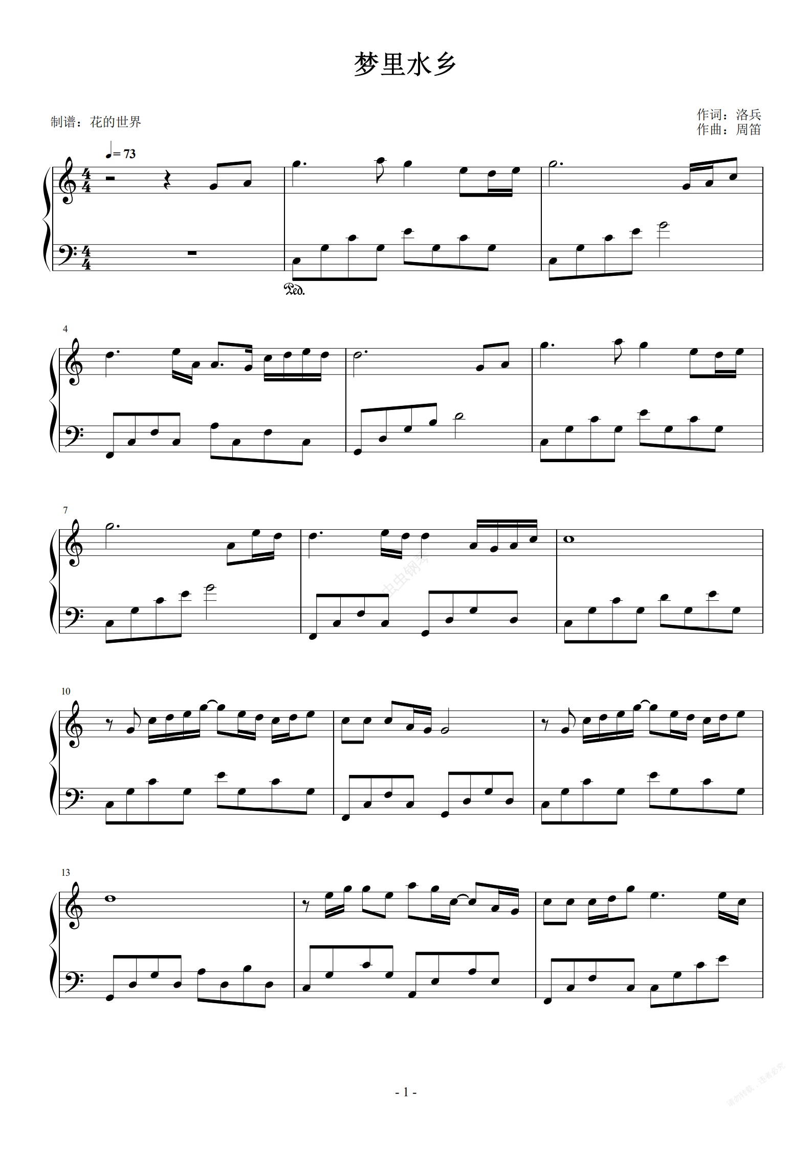 钢琴谱:梦里水乡 C调简易版 江珊 流行经典