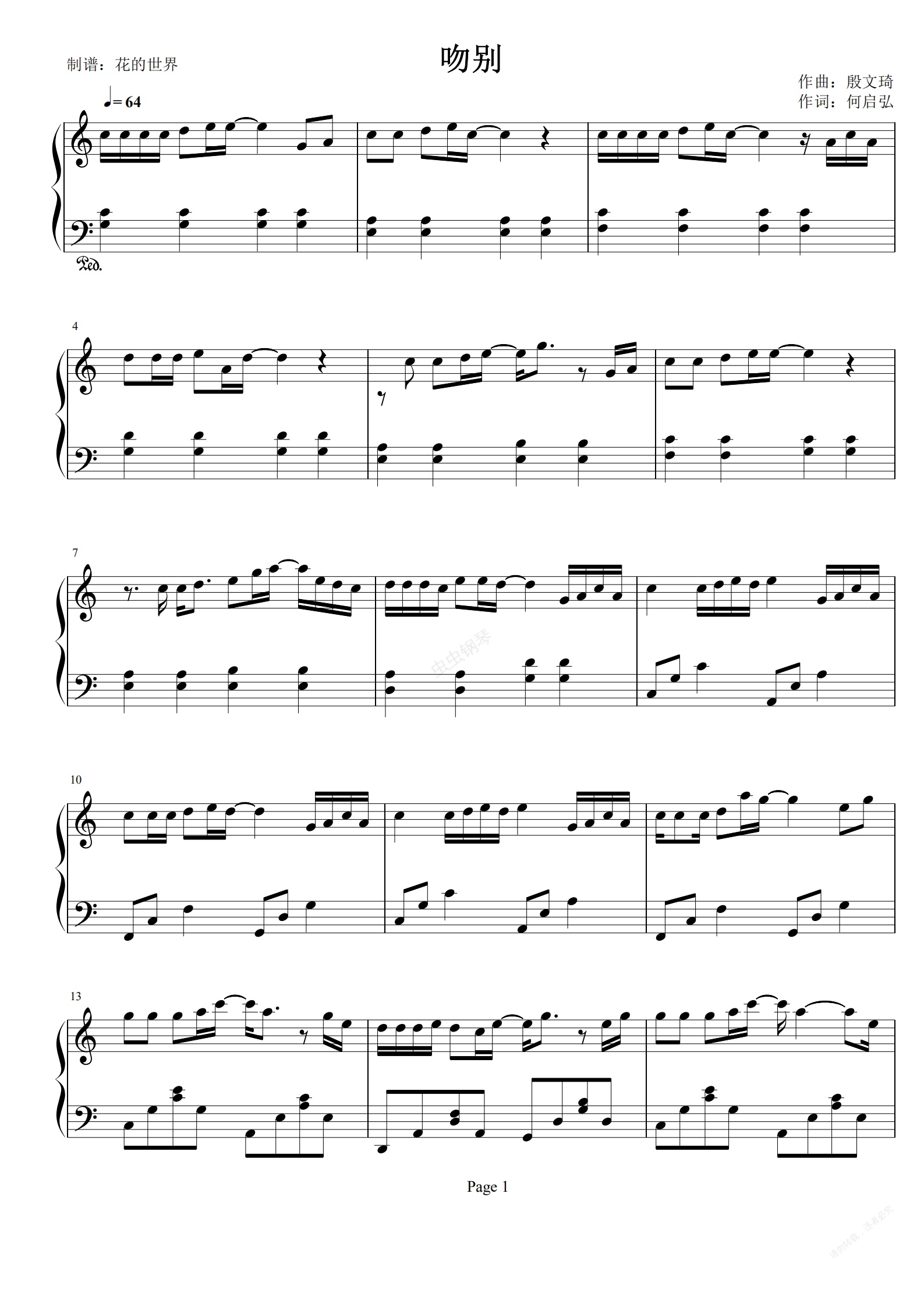钢琴谱:吻别 C调简易版 张学友 流行经典