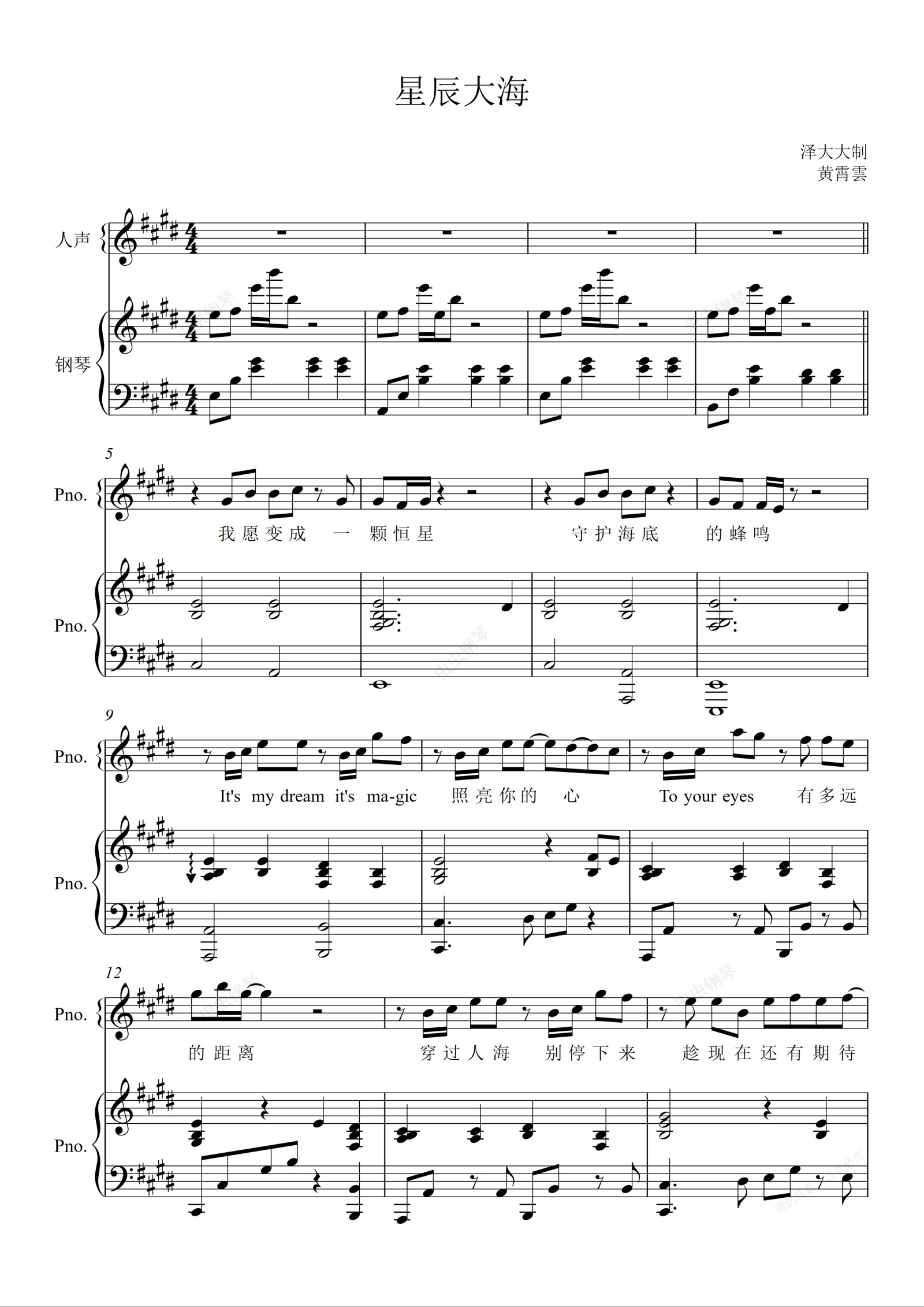 钢琴谱:星辰大海【原版弹唱附词】泽大大 黄霄雲