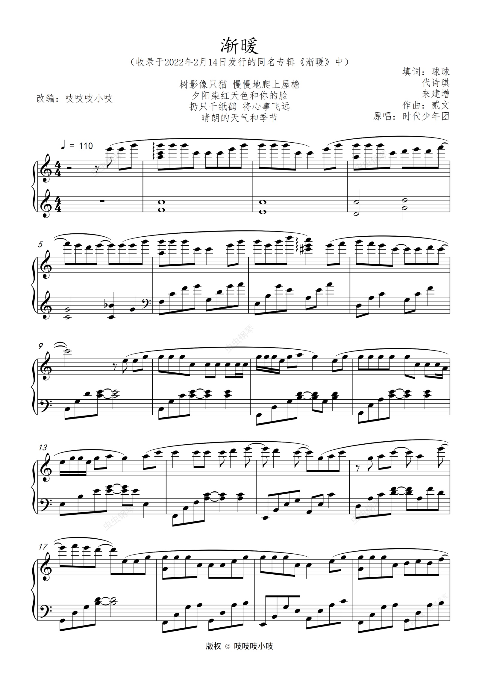 钢琴谱:渐暖(C调)时代少年团 吱吱改编版
