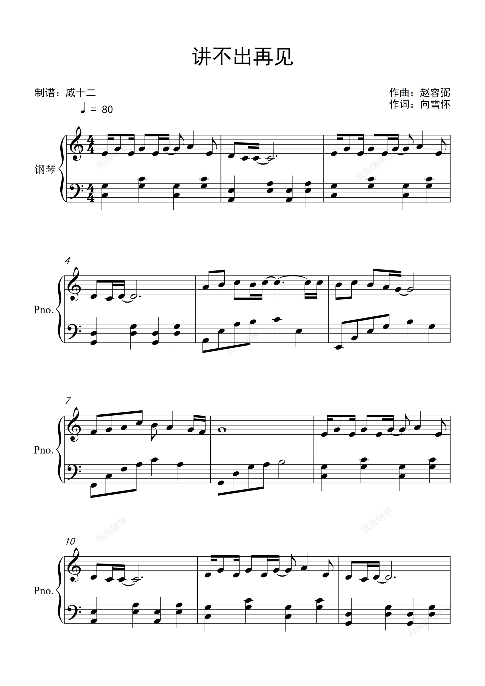 钢琴谱:讲不出再见-C调简单版