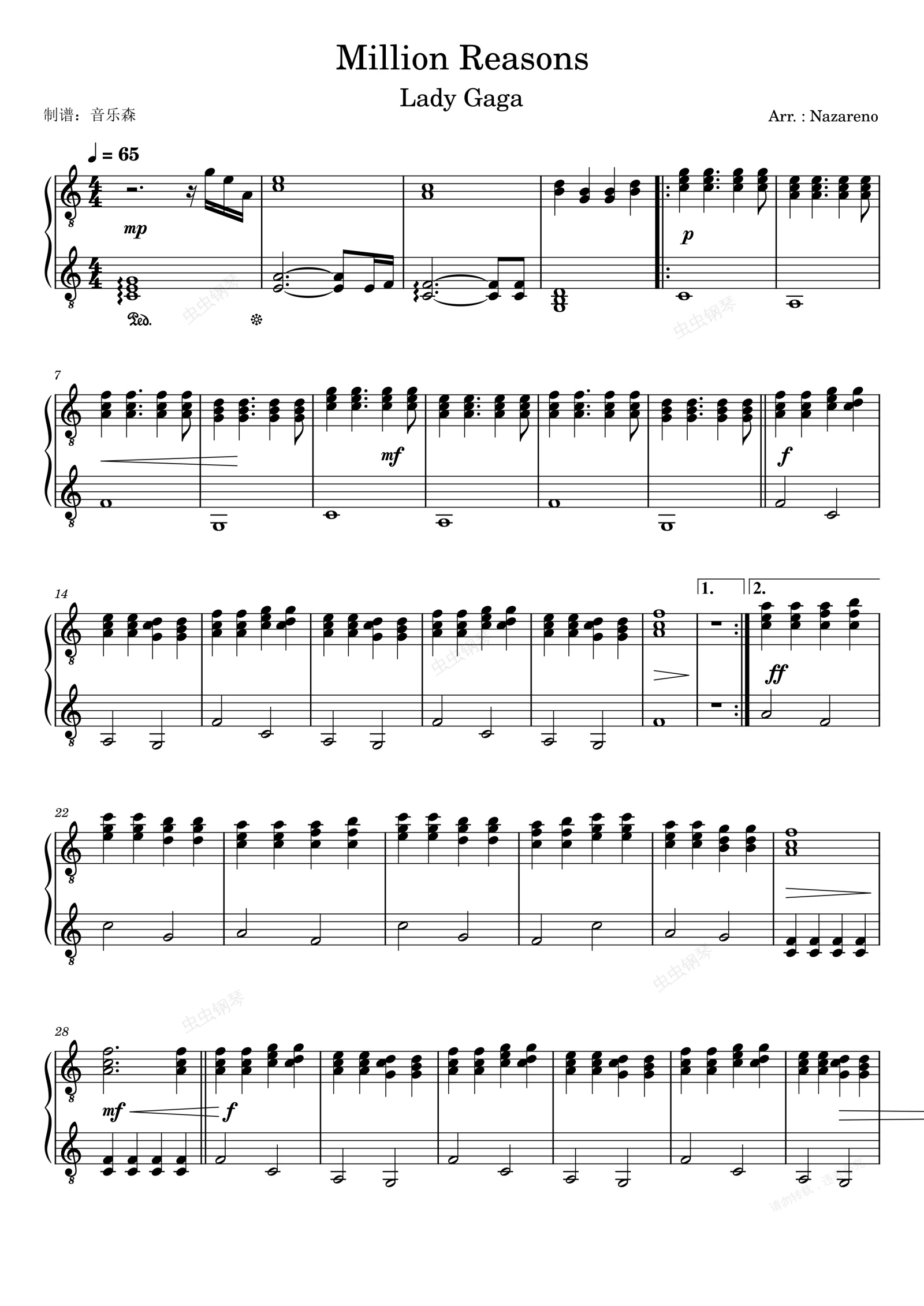 钢琴谱:钢琴独奏 Million Reasons-Piano Solo-Lady Gaga 欧美歌曲
