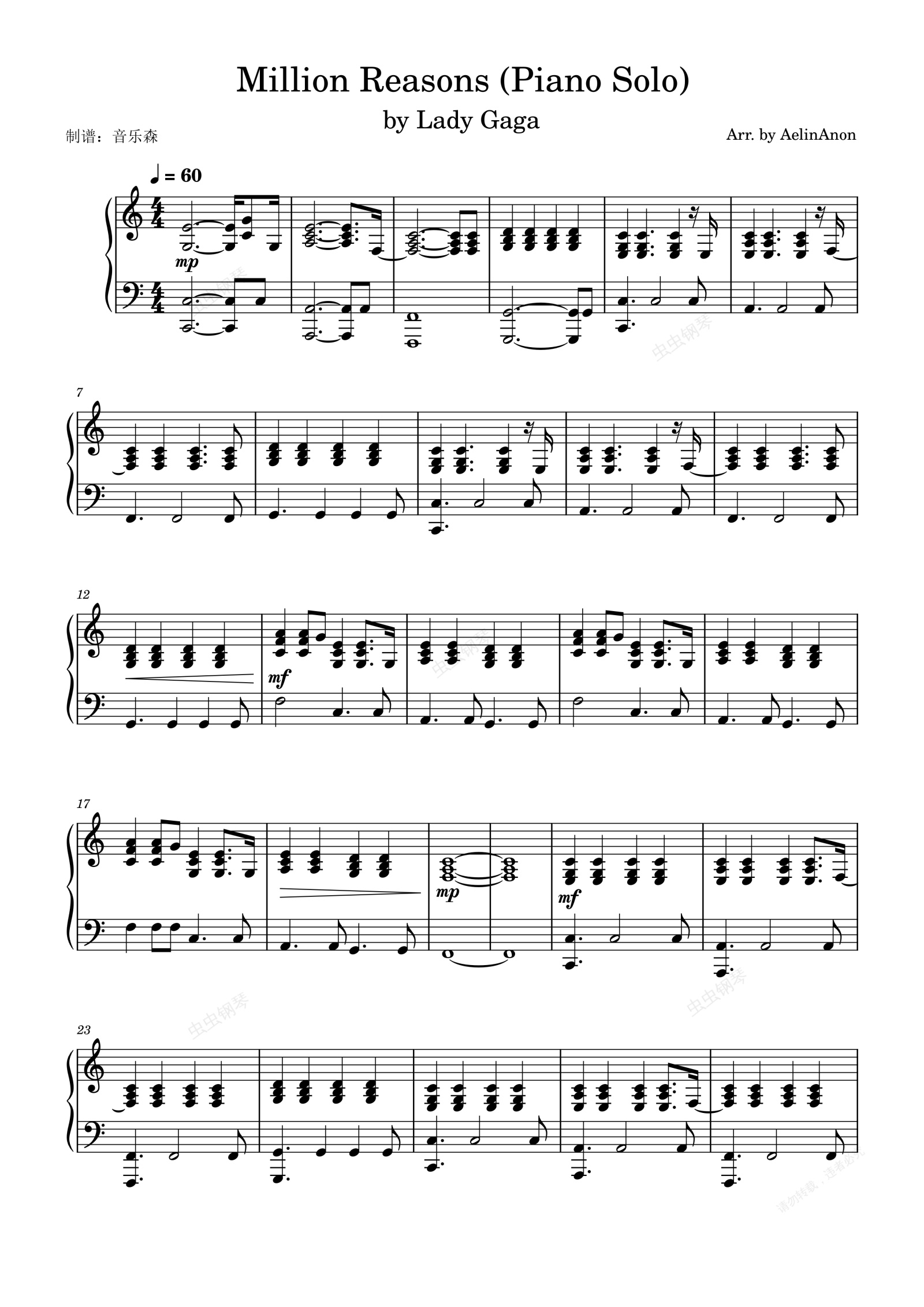 钢琴谱:Million Reasons-Piano Solo-Lady Gaga 欧美歌曲