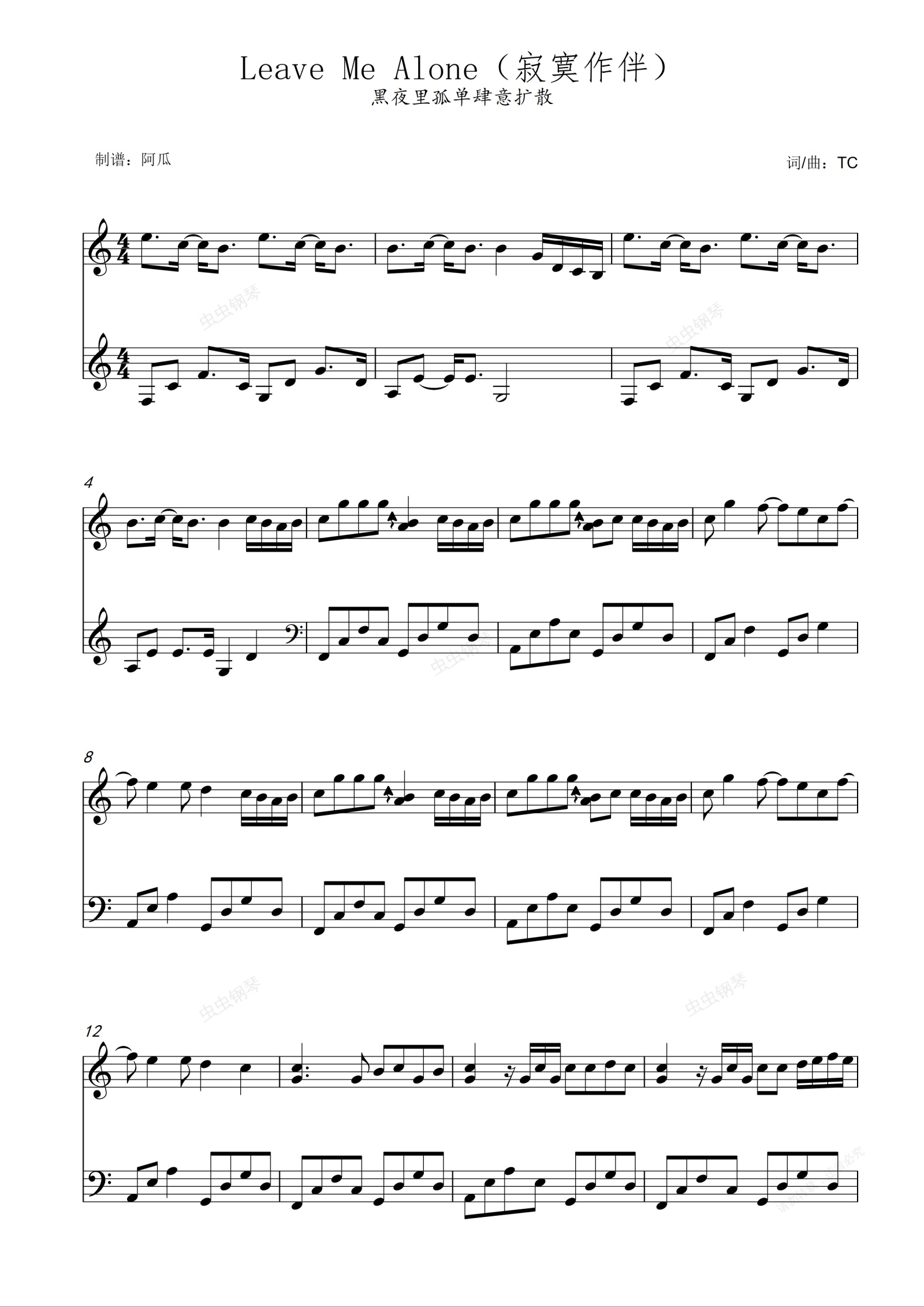 钢琴谱:Leave Me Alone(寂寞作伴)-C调简易