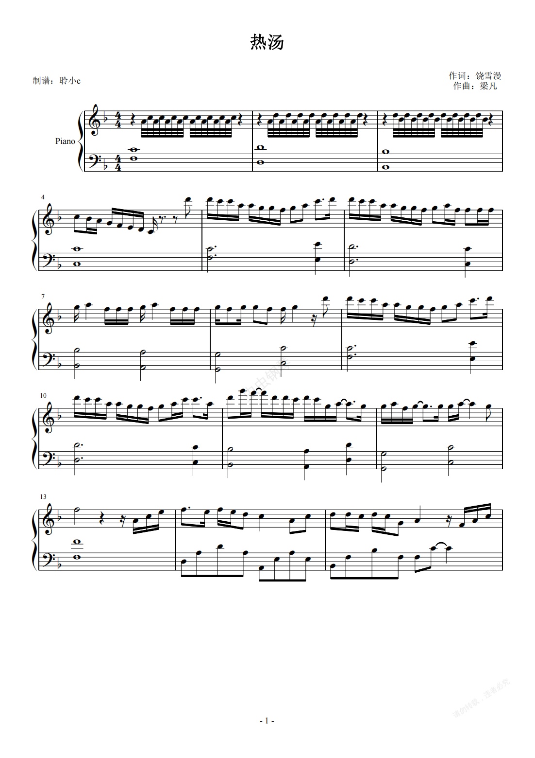 钢琴谱:热汤 独奏版原调