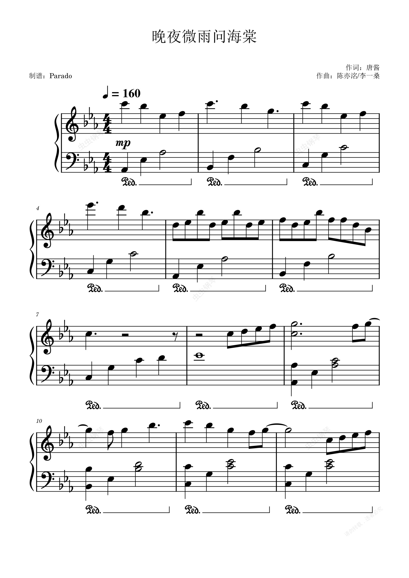 钢琴谱:晚夜微雨问海棠-镜予歌 /喧笑 /陈亦洺-抖音热曲-好听又好弹
