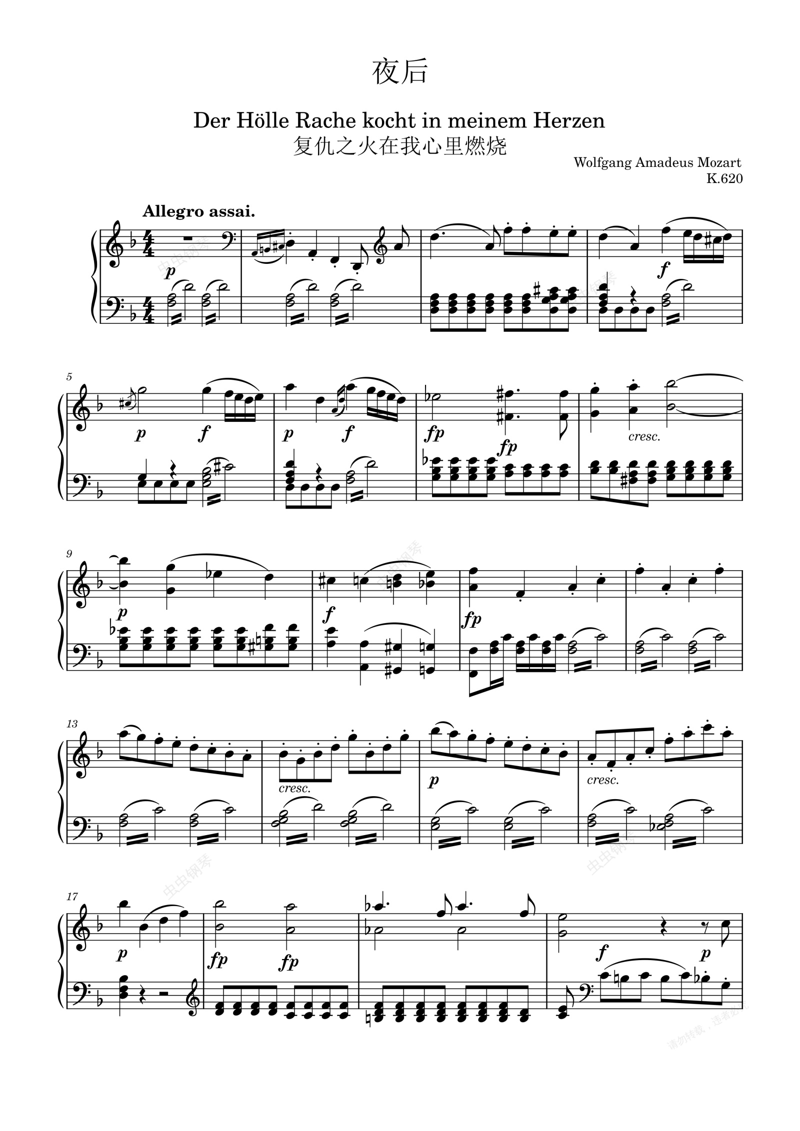 钢琴谱:夜后,选自歌剧《魔笛》(复仇之火在我心里燃烧)