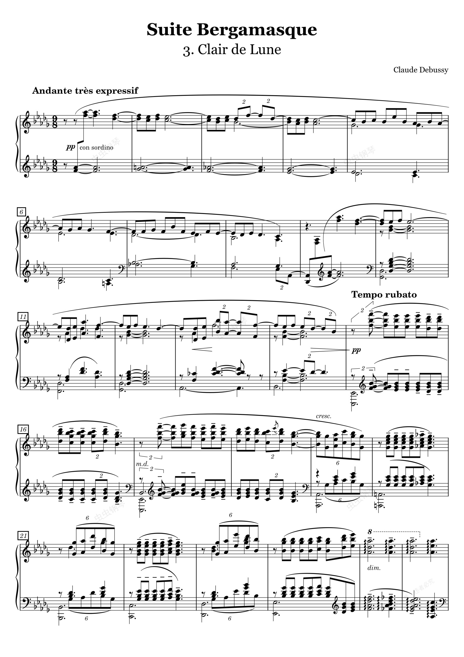 钢琴谱:德彪西 贝加马斯克组曲 Debussy - Clair de Lune (Suite Bergamasque No. 3)