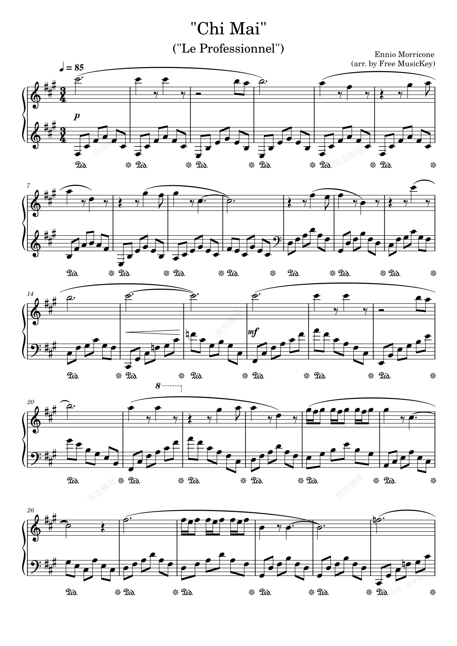 钢琴谱:Chi mai-电影《Maddalena》主题曲 Ennio Morricone Chi Mai from (Le Professionnel) Easy Piano (arr. by Free MusicKey)
