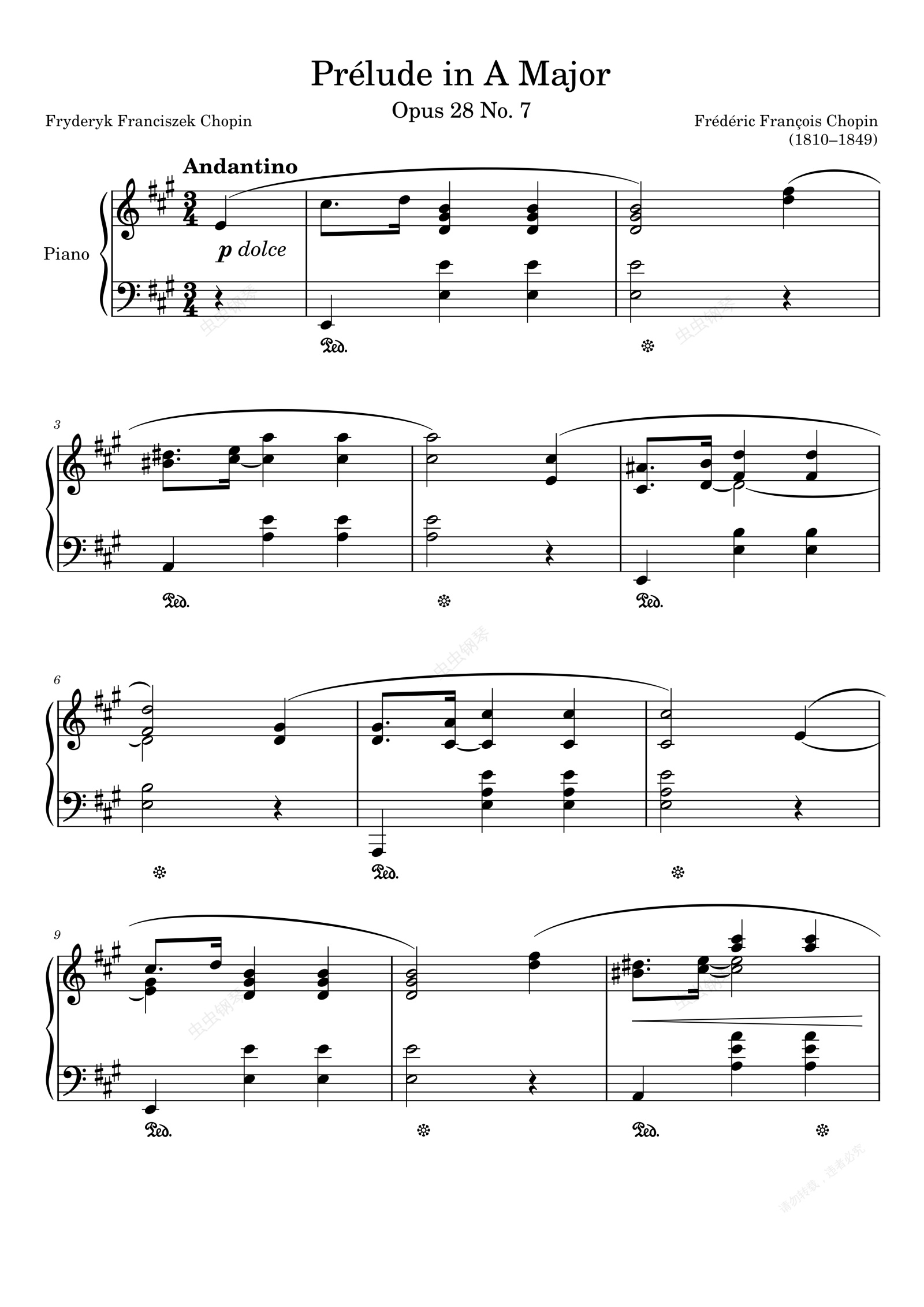 钢琴谱:肖邦 A大调前奏曲 Prélude Opus 28 No. 7 in A Major – Chopin
