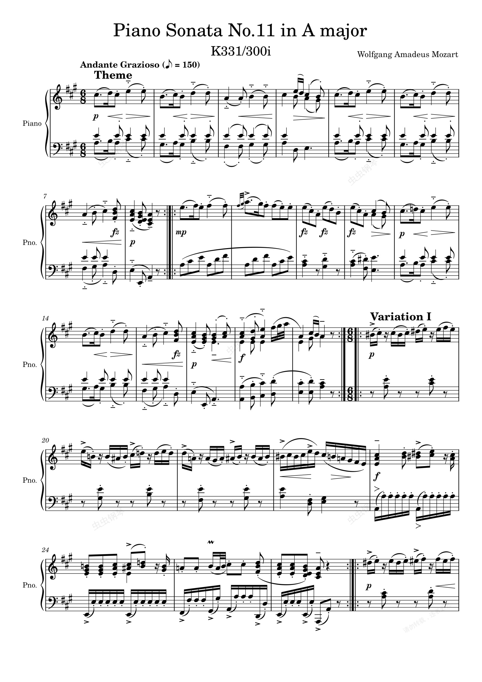 钢琴谱:莫扎特A大调钢琴奏鸣曲K331 Piano Sonata No.11 in A major-K.331(W. A. Mozart)
