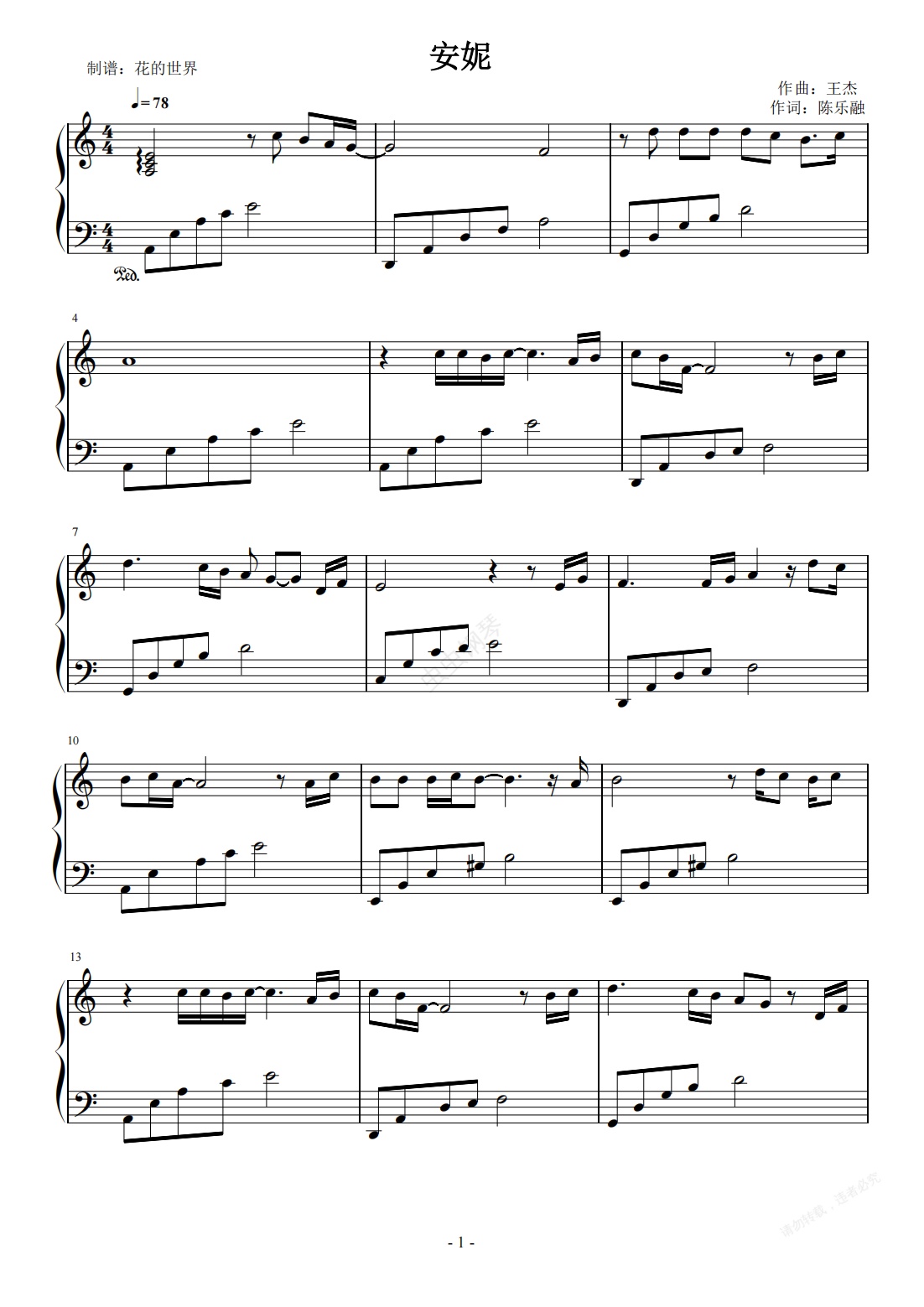 钢琴谱:安妮 C调简易版 王杰 流行经典
