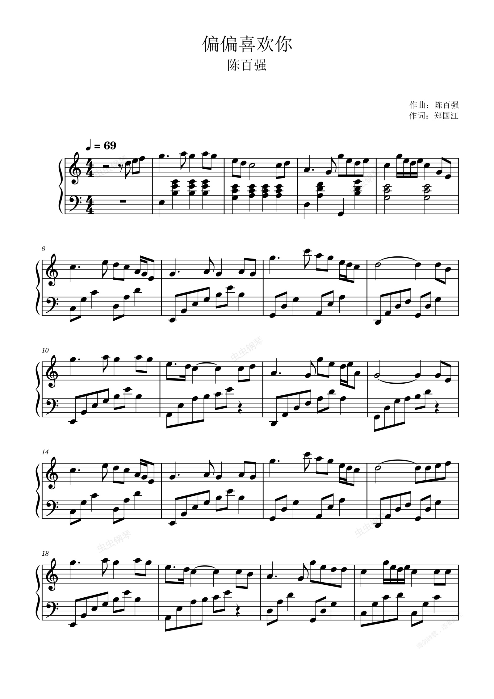 钢琴谱:偏偏喜欢你(C大调编配,适合入门弹奏)