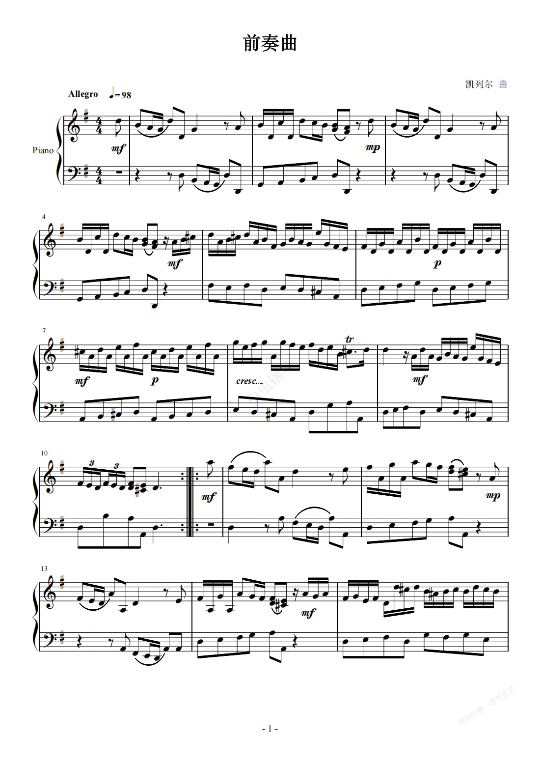 钢琴谱:《前奏曲(凯列尔)》川音六级