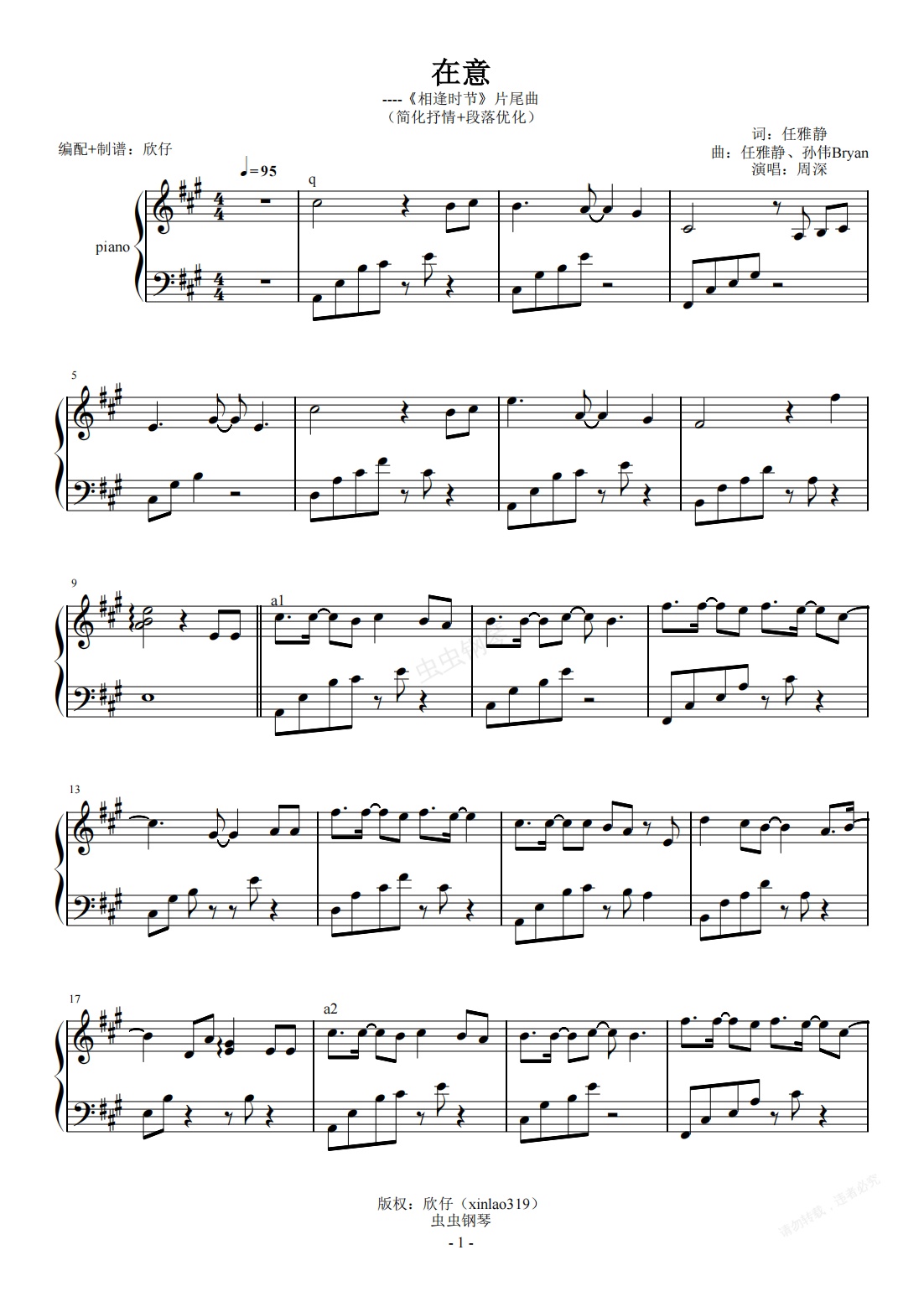 钢琴谱:周深-A《在意》(简化抒情、段落优化、《相逢时节》片尾曲)