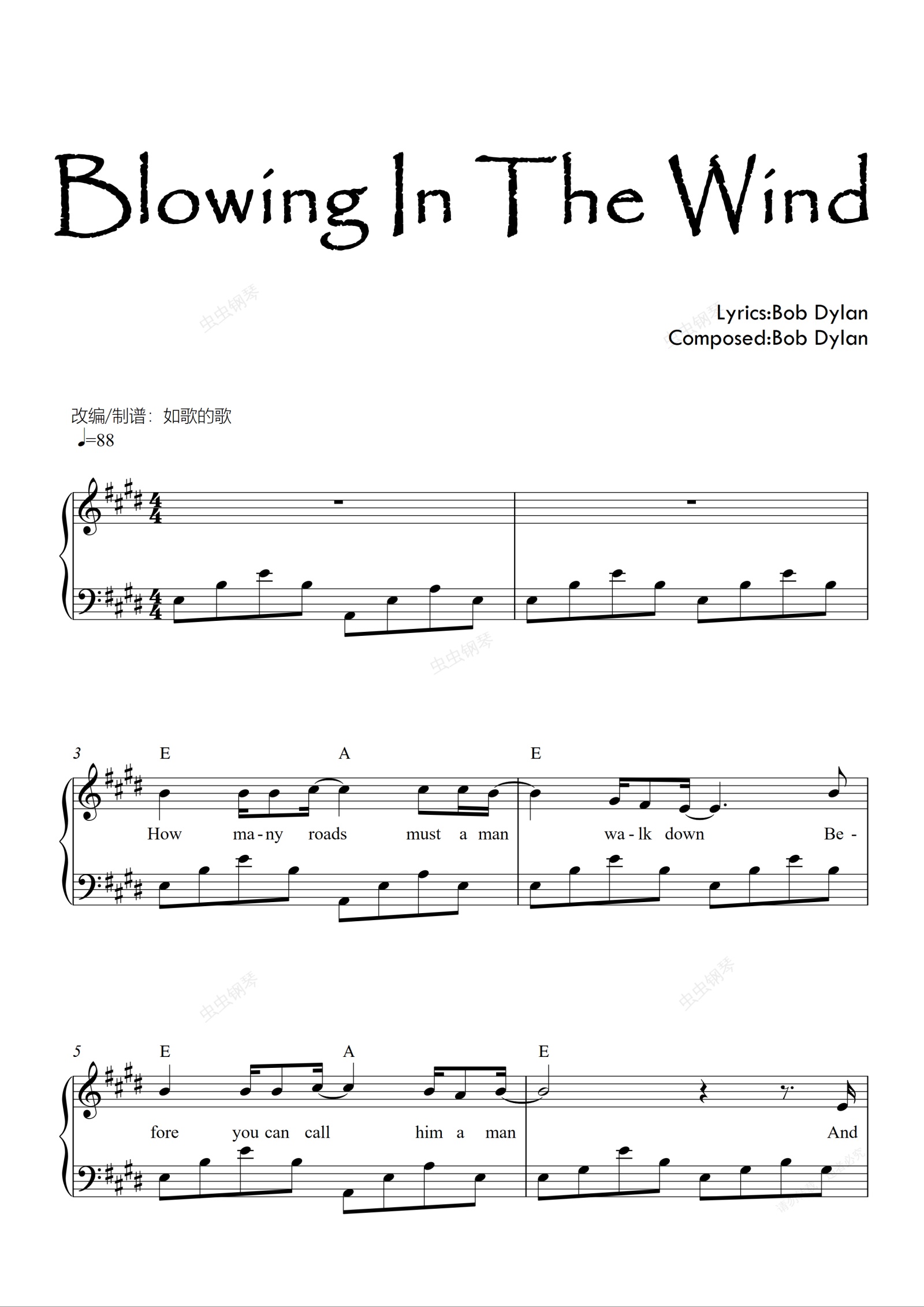 钢琴谱:Blowing In The Wind获诺贝尔文学奖的治愈反战民谣可弹唱