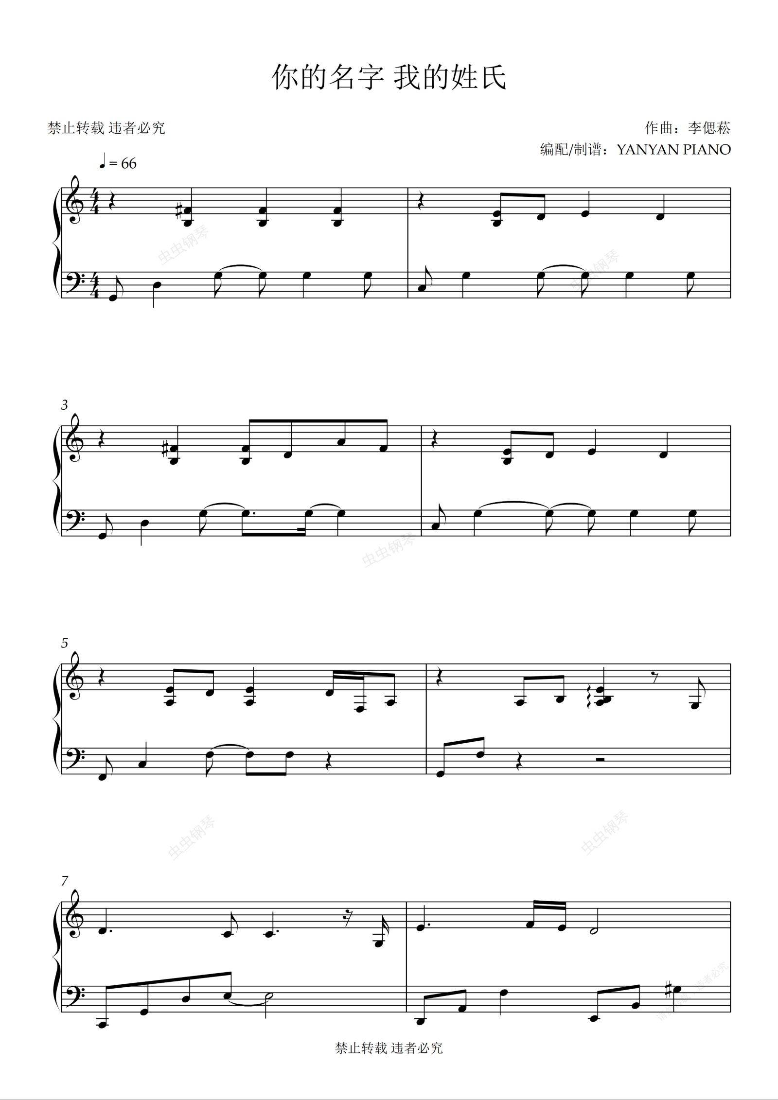 钢琴谱:好听易弹【你的名字 我的姓氏】张学友