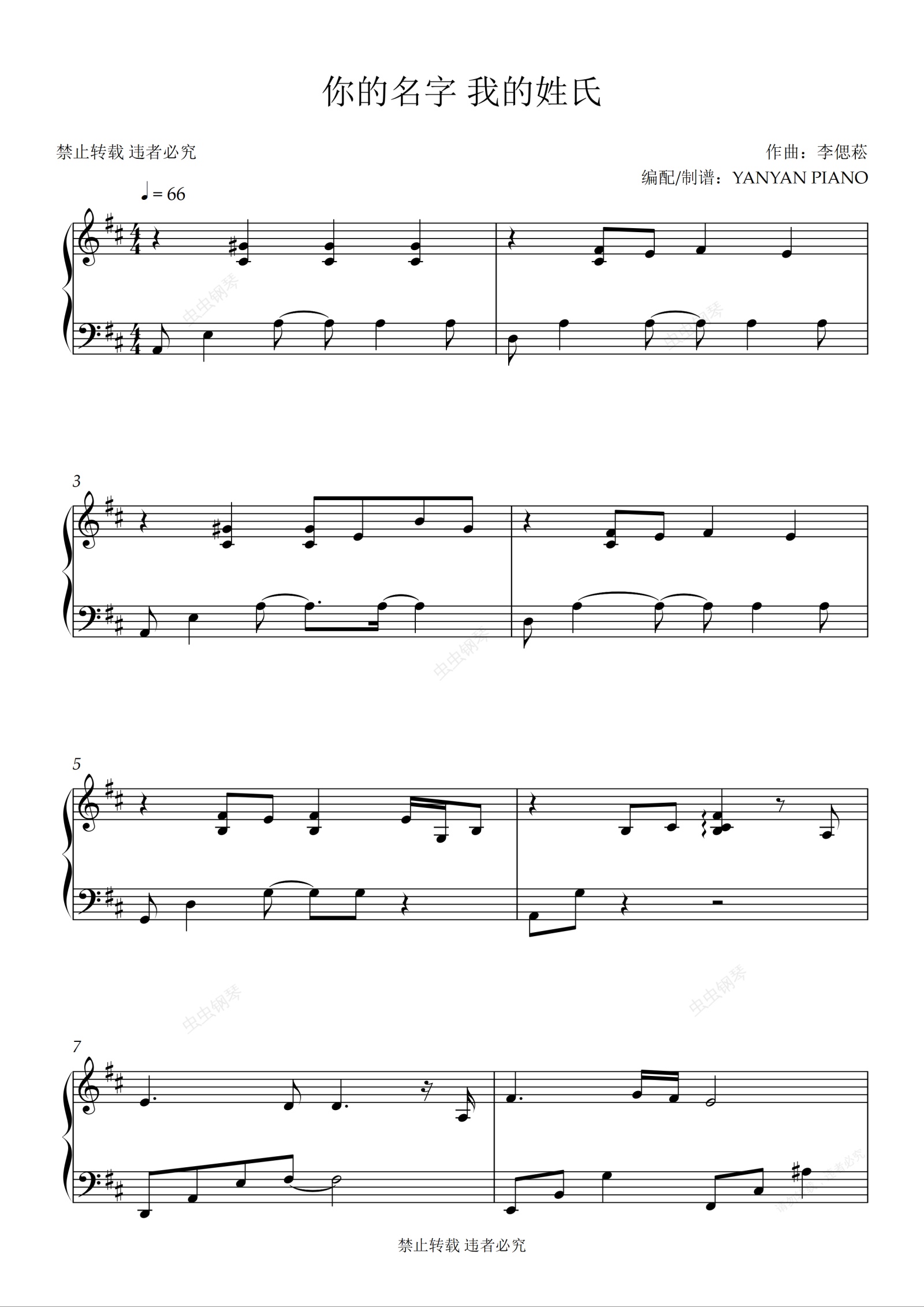 钢琴谱:好听易弹【你的名字 我的姓氏】张学友