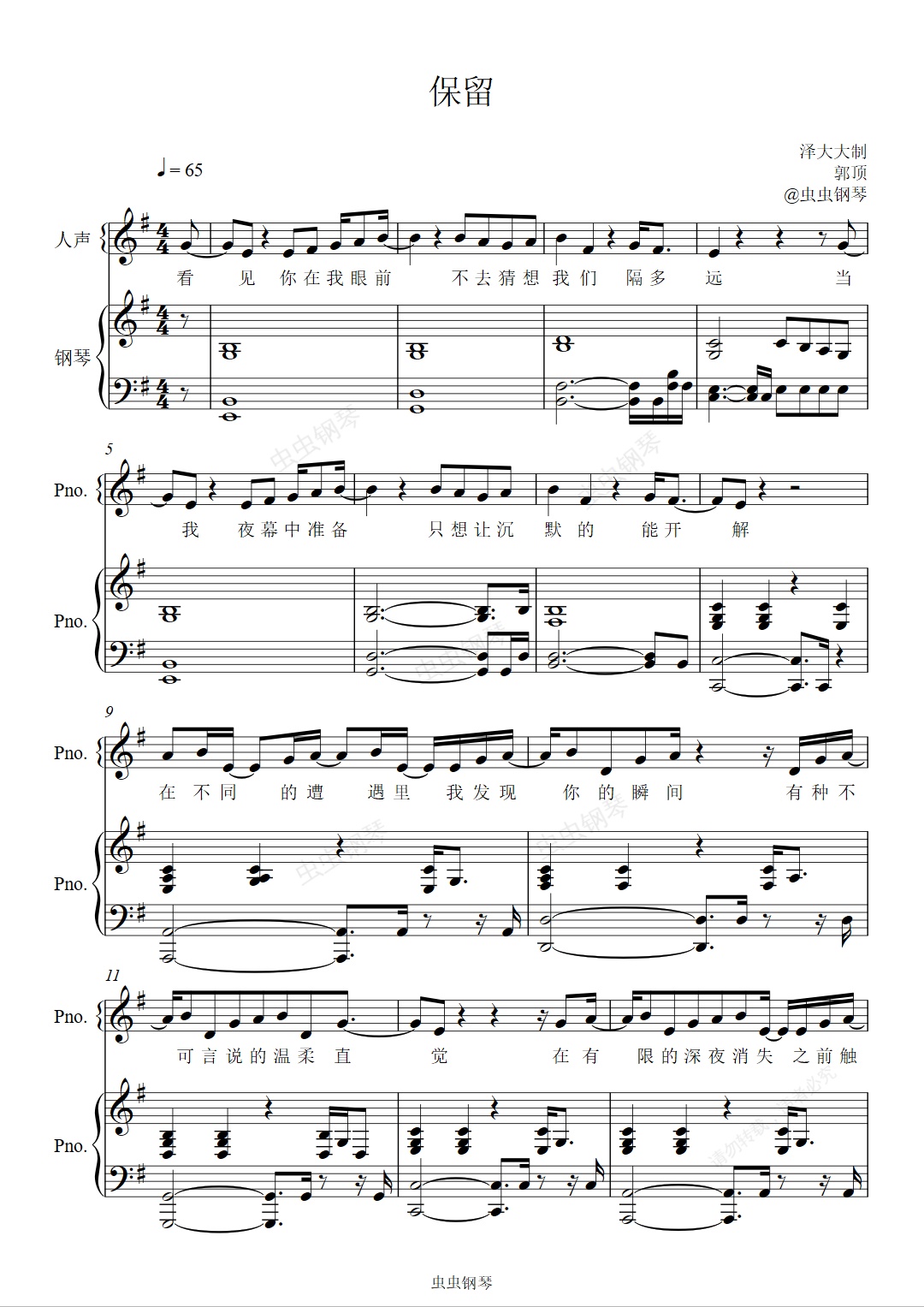 钢琴谱:保留【原版弹唱附词】泽大大 郭顶