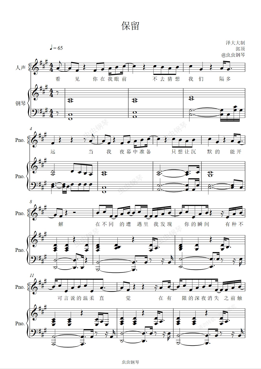 钢琴谱:保留【女生弹唱附词】泽大大 郭顶