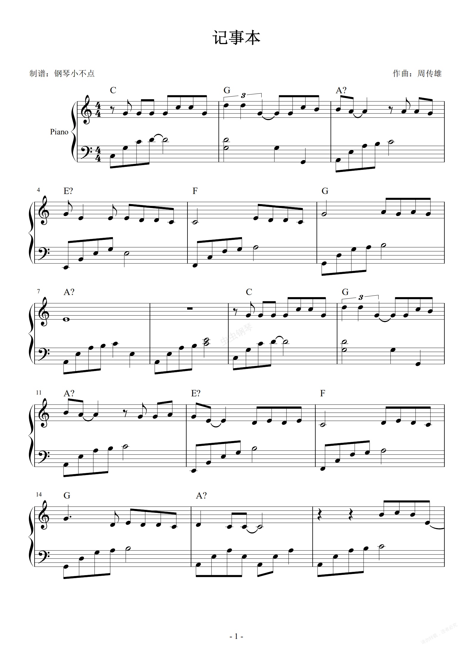 钢琴谱:记事本 【简易版】