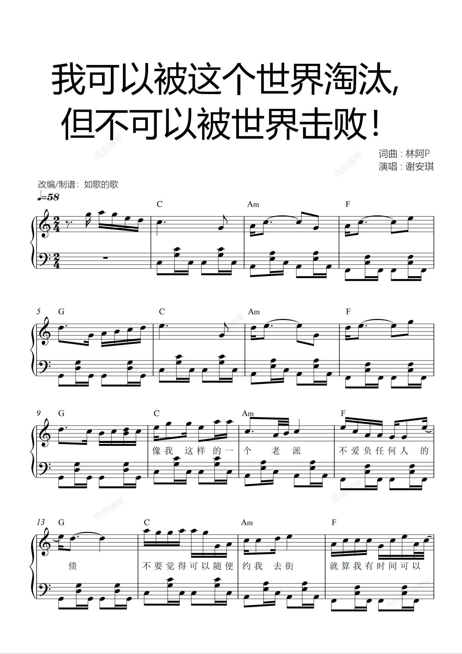 钢琴谱:我可以被这个世界淘汰, 但不可以被世界击败mla式粤语歌可弹唱