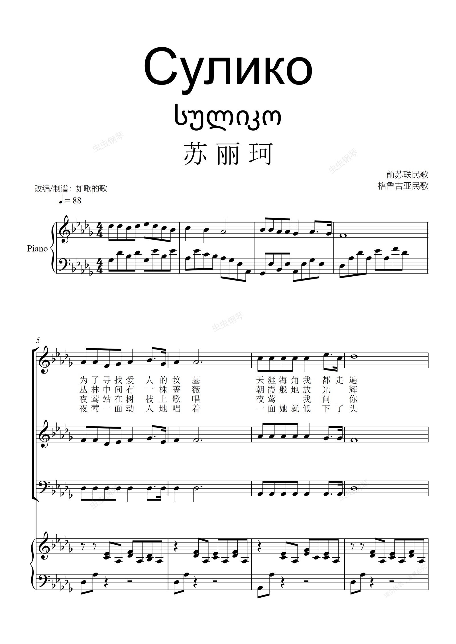 钢琴谱:苏丽珂Сулико前苏联格鲁吉亚情歌电视悬崖插曲合唱+钢伴bD调