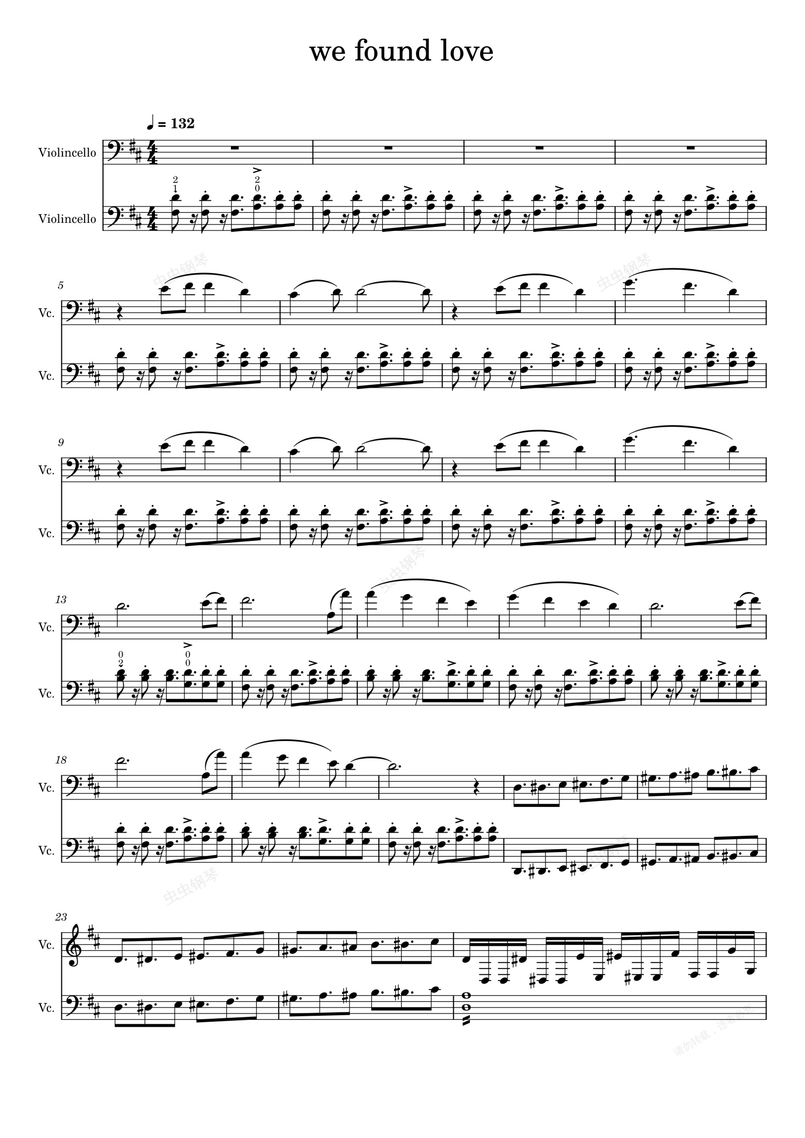 钢琴谱:We Found Love-for 2cellos 大提琴二重奏