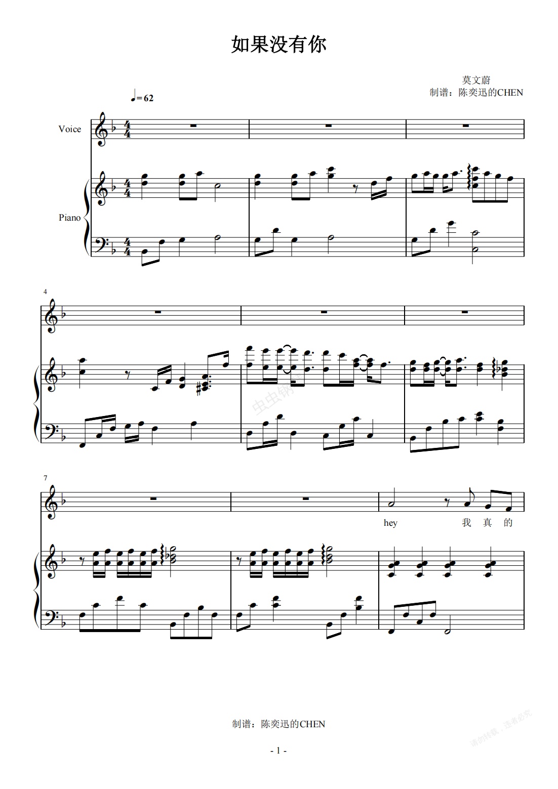 钢琴谱:如果没有你 完美弹唱谱男生版【附歌词】
