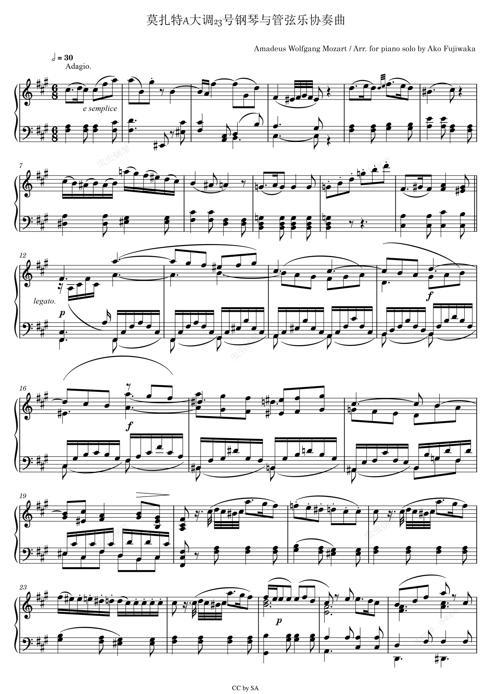 钢琴谱:莫扎特A大调23号钢琴与管弦乐协奏曲 第二乐章Mozart K.488 Piano Concerto #23 in A 2nd mov. Adagio for piano solo