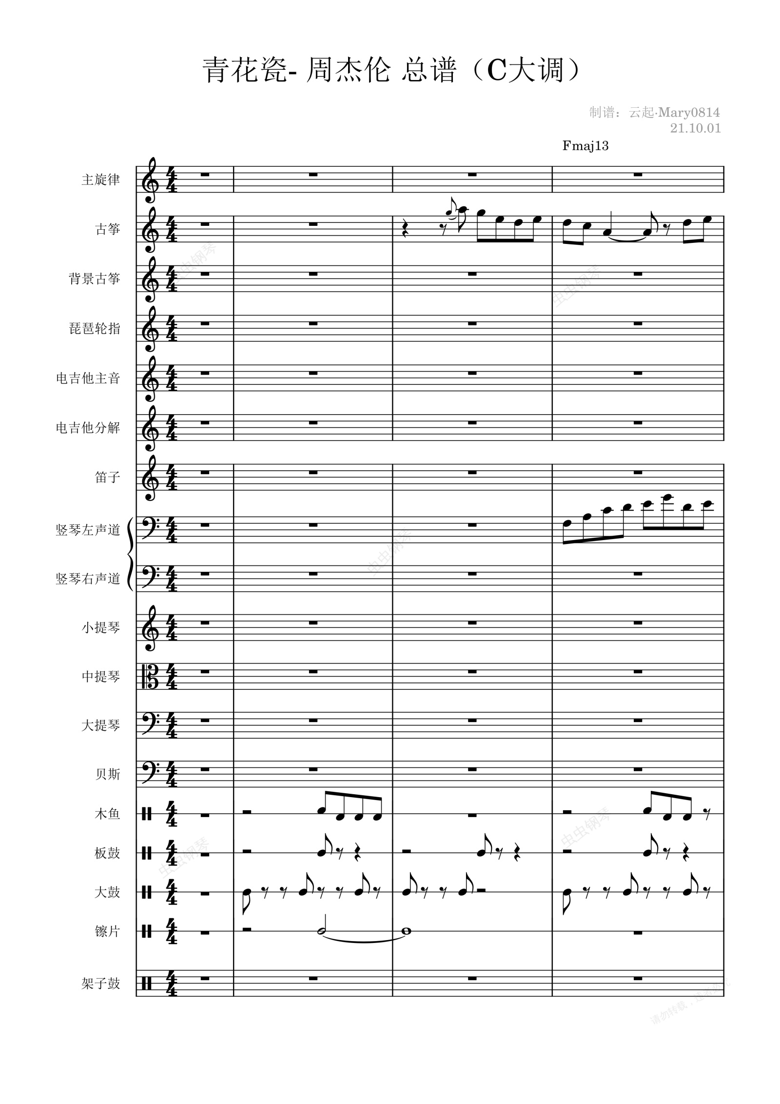 钢琴谱:青花瓷- 周杰伦 总谱(C大调 含和弦标记、歌词)
