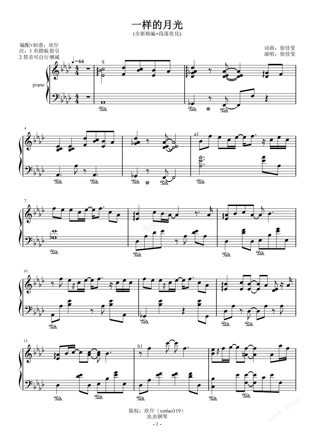 钢琴谱:徐佳莹-降A《一样的月光》(全新精编+段落优化)