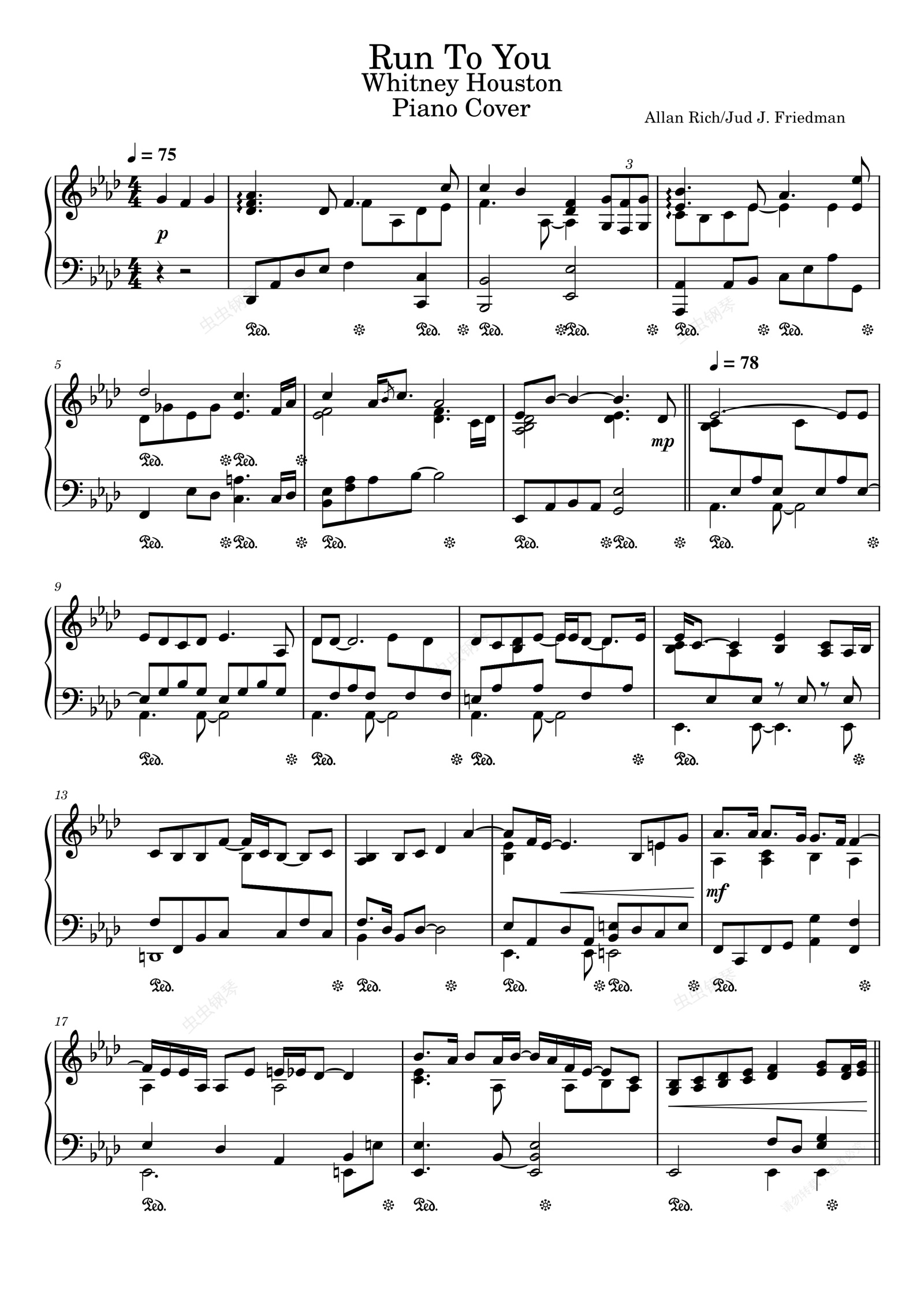 钢琴谱:惠特妮·休斯顿-Run To You-Whitney Houston